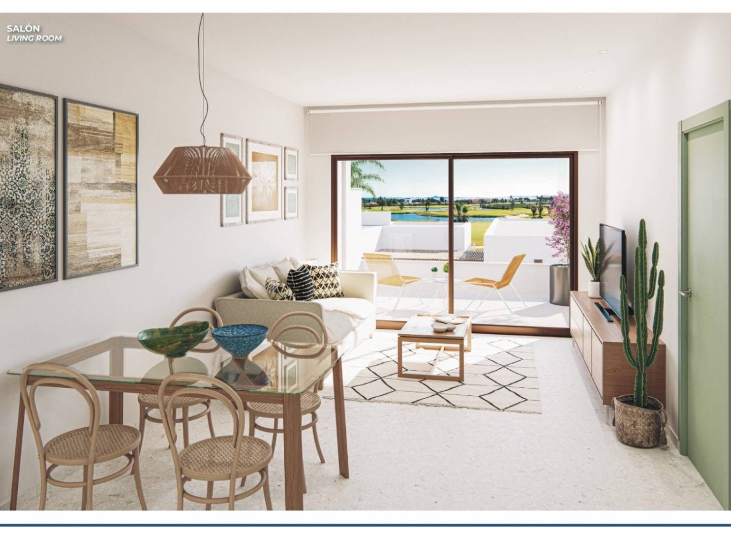 Appartement op de begane grond van 71,40 m², bestaande uit een ruime woonkamer met een prachtige open keuken met kookeiland en ontbijtbar, toegang tot een groot terras van 38,25 m² met een fantastisch uitzicht op de golfbaan, twee tweepersoonsslaapkamers met inbouwkasten, waarvan één een en-suite badkamer en een aparte badkamer.