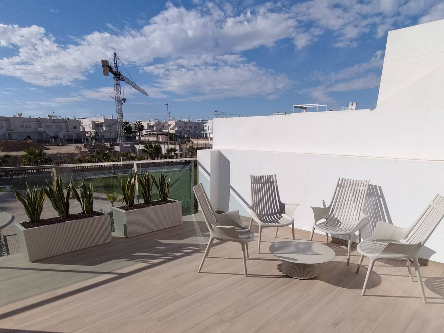 De buitenruimtes van deze woningen zijn ontworpen om optimaal te genieten van het mediterrane klimaat. Elke woning heeft een terras, ideaal om buiten te ontspannen of te genieten van maaltijden in de open lucht. Bovendien bevatten sommige typologieën een solarium, wat een extra ruimte biedt om te zonnebaden of een privé ontspanningsruimte te creëren. De tuinen, aanwezig in bepaalde configuraties, bieden een vleugje natuur en een perfecte ruimte voor buitenactiviteiten. De toevoeging van pergola's aan de buitenruimtes voegt een element van schaduw en stijl toe, waardoor het mogelijk is om zelfs op de zonnigste dagen van buiten te genieten.