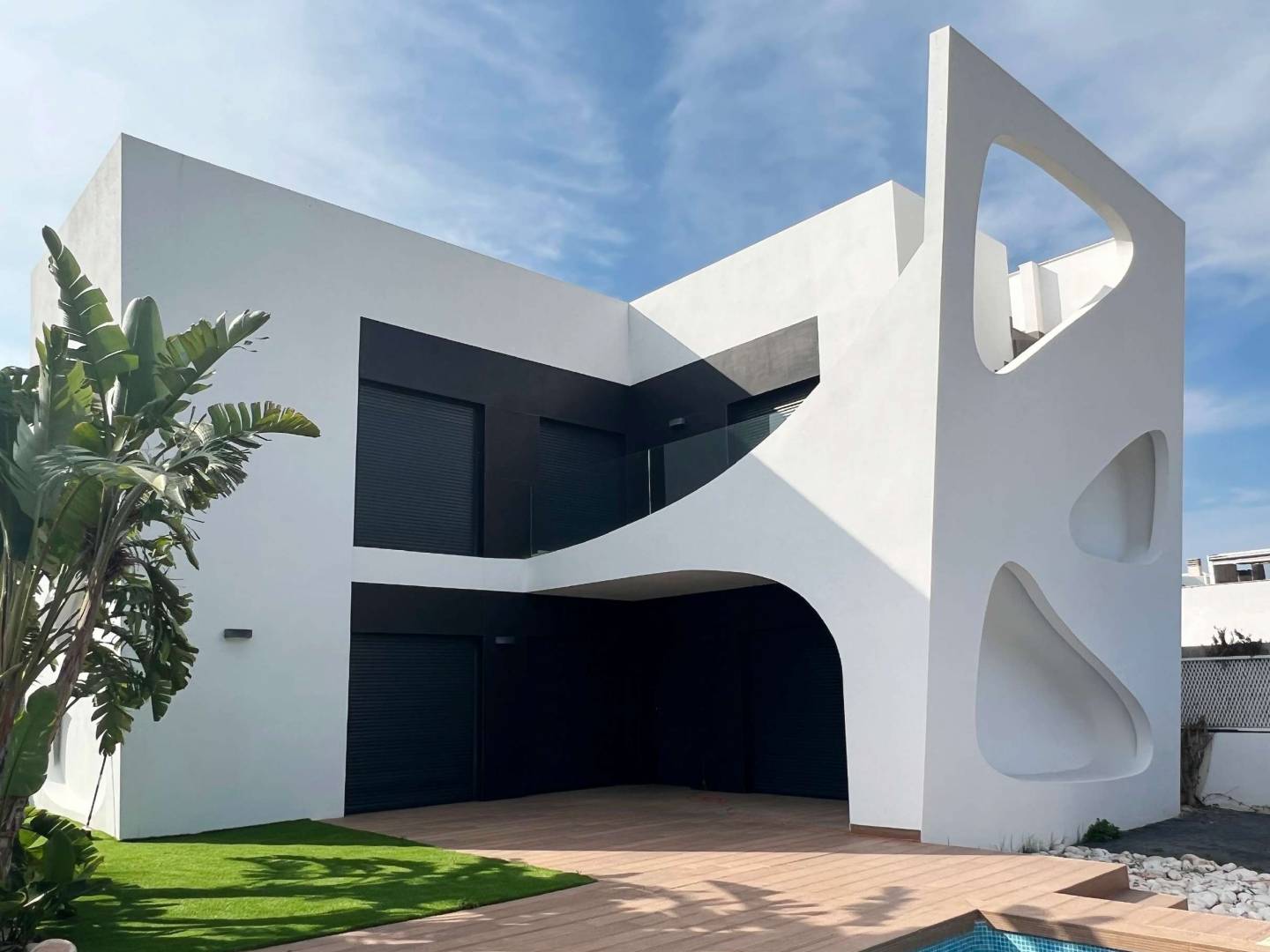 De buitenruimtes van deze vrijstaande woningen zijn ontworpen om optimaal te genieten van het mediterrane klimaat. Elke woning heeft een privé tuin, ideaal om een persoonlijke oase van ontspanning en vermaak te creëren. De aanwezigheid van een privézwembad in elke woning voegt een vleugje luxe en exclusiviteit toe, waardoor u kunt genieten van verfrissende baden in de privacy van uw eigen huis. Bovendien bieden de terrassen extra buitenruimte, perfect om buiten te dineren of gewoon te ontspannen in de zon. De toevoeging van een solarium biedt extra ruimte om te zonnebaden en te genieten van het panoramische uitzicht op de omgeving.