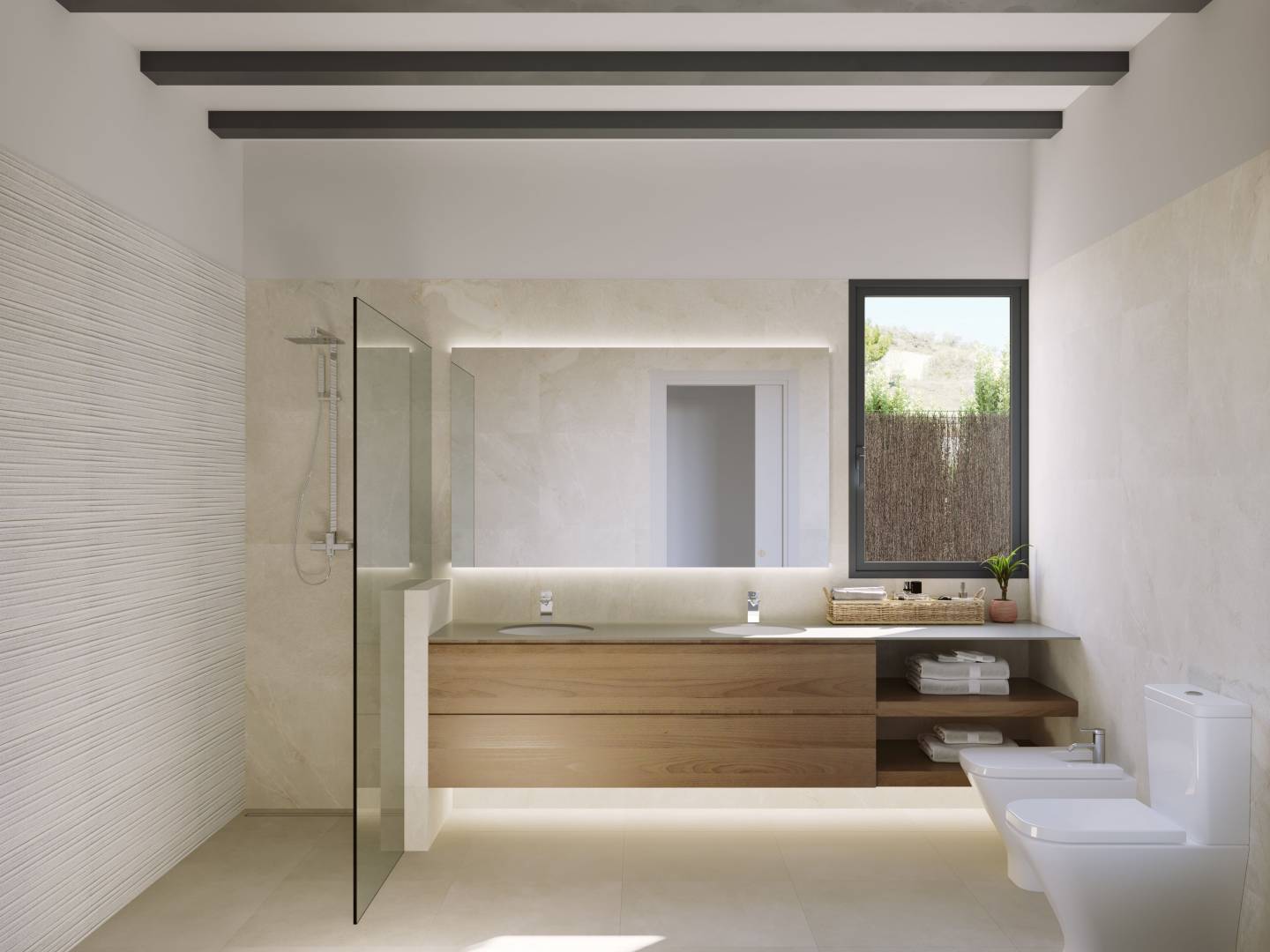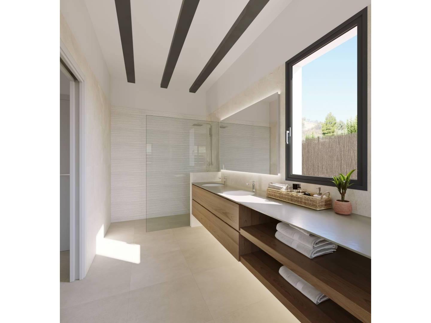Het interieur van de woningen is ontworpen met een focus op kwaliteit en comfort. De porseleinen tegelvloeren geven een moderne en elegante uitstraling, terwijl de vloerverwarming zorgt voor een warme en gezellige sfeer het hele jaar door. Elektrische rolluiken en inbegrepen apparaten maken het dagelijks leven gemakkelijker, en de inbouwkasten bieden efficiënte en discrete opslag. Elk detail is overwogen om een functioneel en esthetisch aangenaam huis te bieden.