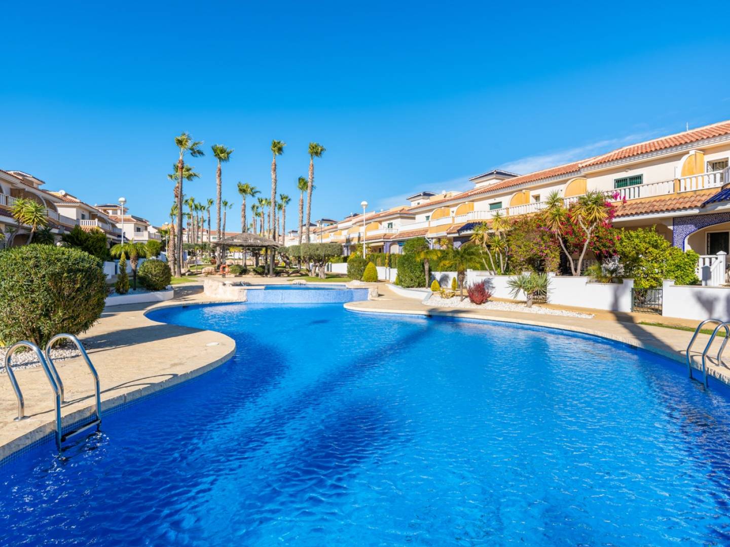 Ontdek dit elegante penthouse-appartement in een prestigieuze residentie in de gewilde wijk Doña Pepa . Met een oppervlakte van 79,27 m² biedt het twee tweepersoonsslaapkamers met inbouwkasten en twee badkamers – een comfortabele en functionele woonomgeving. De lichte, open woon-/eetkamer met een open keuken geeft direct toegang tot een ruim terras op het westen . Hier kunt u het hele jaar door genieten van de middagzon en het mediterrane klimaat. Een buitentrap leidt vanaf het terras naar een spectaculair privésolarium met opbergruimte en een ingebouwde barbecue . Vanaf hier heeft u een adembenemend uitzicht op Torrevieja en de zoutvlaktes van La Mata . Een perfecte plek om te ontspannen of tijd door te brengen met familie en vrienden. Het appartement wordt volledig gemeubileerd en direct te betrekken verkocht en beschikt over een eigen parkeerplaats . De residentie biedt diverse gemeenschappelijke zwembaden, een kinderbad, uitgestrekte tuinen en parkeergelegenheid . Winkels, restaurants en alle voorzieningen zijn binnen handbereik. Een uitstekende kans als hoofdverblijf, tweede huis of investeringsobject aan de Costa Blanca .