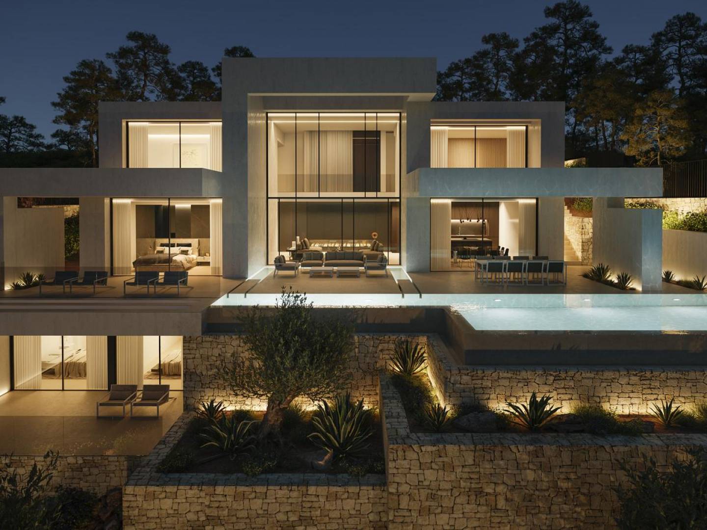 Binnen beschikt de villa over een indrukwekkende indeling met vier ruime slaapkamers en zes elegant ontworpen badkamers, wat zorgt voor voldoende ruimte voor familie en gasten. De verfijnde porseleinen vloeren versterken de moderne esthetiek van de villa, terwijl het geavanceerde huisautomatiseringssysteem extra gemak biedt. Ingebouwde kasten bieden een naadloze en stijlvolle opbergoplossing, die het luxe gevoel van de villa aanvult.