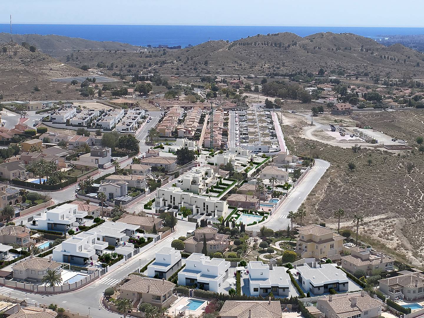 Het buitendesign van deze geschakelde woningen in Busot is ontworpen om optimaal te genieten van het mediterrane klimaat. Elke woning beschikt over een privétuin, perfect om een persoonlijke groene ruimte te creëren of om buitenmomenten met het gezin te genieten. Bovendien bieden de terrassen een ideale plek om te ontspannen of gasten te ontvangen, en bieden ze extra ruimte die perfect integreert met de natuurlijke omgeving. De aanwezigheid van een privézwembad in elke woning voegt een vleugje luxe en exclusiviteit toe, waardoor u zich kunt verfrissen en van de zon kunt genieten in de privacy van uw huis. De buitenomgeving is zorgvuldig ontworpen om de mediterrane levensstijl aan te vullen en biedt een perfecte balans tussen natuur en comfort.