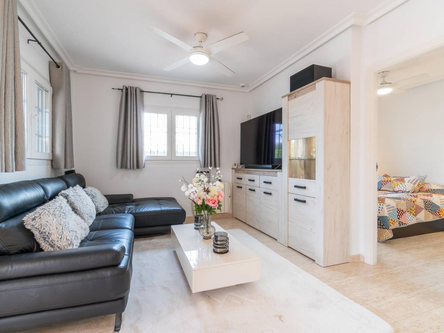 Ontdek deze lichte, gelijkvloerse woning in een van de meest gewilde woonwijken van Orihuela Costa , op slechts 1500 meter van de zee . Deze elegante woning biedt 89 m² woonruimte, verdeeld over drie slaapkamers en twee badkamers , en is ideaal als permanente woning of exclusief vakantiehuis . De gunstige ligging op het westen zorgt voor prachtig natuurlijk licht gedurende de middag, met name vanaf het spectaculaire privéterras met adembenemend uitzicht – perfect om te ontspannen en van de natuur te genieten. De begane grond bestaat uit een ruime en lichte woon- en eetkamer , een moderne open keuken met toegang tot een bijkeuken en berging, een slaapkamer en een gerenoveerde badkamer . De bovenverdieping omvat nog twee slaapkamers , een gerenoveerde badkamer en een zonnig terras . De woning wordt volledig gemeubileerd en direct te betrekken verkocht. Het complex beschikt over prachtig aangelegde tuinen en een schitterend gemeenschappelijk zwembad – een ideale plek voor het hele gezin om te ontspannen en te genieten. De toplocatie biedt directe toegang tot winkels , scholen , openbaar vervoer en het bekende winkelcentrum La Zenia Boulevard . Deze woning biedt een unieke kans om een huis aan de Costa Blanca te kopen dat rust, comfort en de nabijheid van de zee combineert .