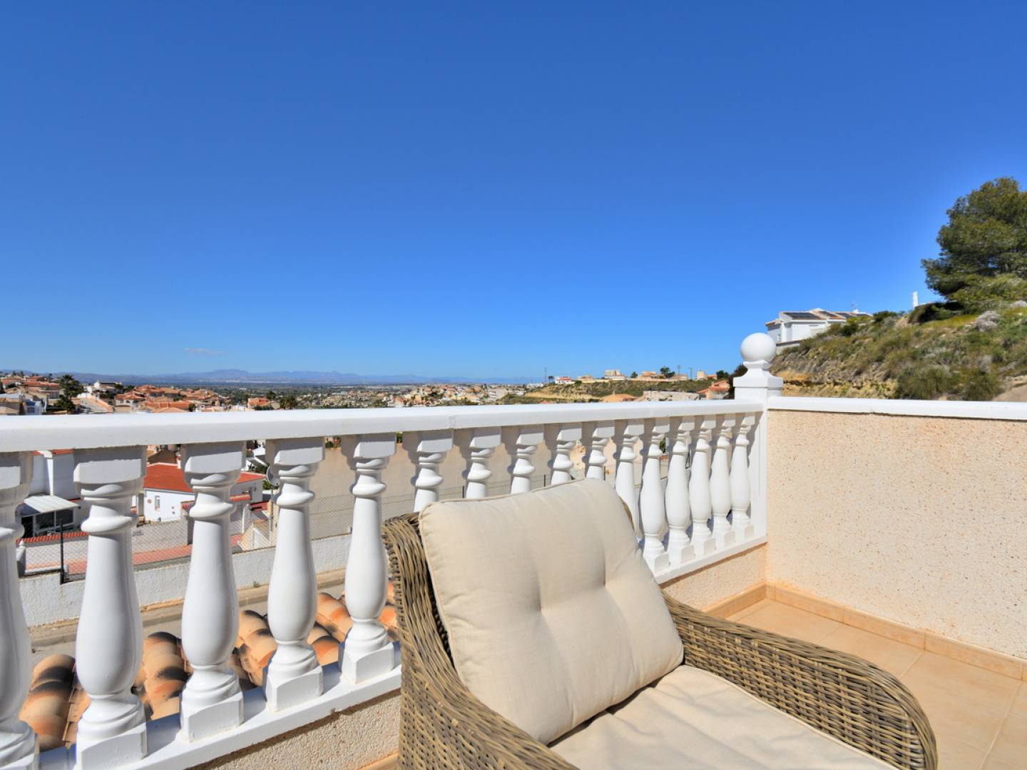Deze charmante, twee verdiepingen tellende halfvrijstaande villa is gelegen op een toplocatie in La Marquesa, Rojales, en biedt een prachtig panoramisch uitzicht op het Crevillente-gebergte. De woning is bereikbaar via een eigen oprit, wat zorgt voor privacy en rust. Buiten beschikt de woning over een volledig betegeld terras en parkeergelegenheid op eigen terrein. Bij binnenkomst leidt een fraai glazen terras naar de ruime en lichte woon-eetkamer. Op de begane grond bevinden zich tevens een badkamer, een slaapkamer, een volledig ingerichte keuken en een praktische aparte bijkeuken. Op de eerste verdieping vindt u de tweede badkamer en de tweede slaapkamer, die directe toegang biedt tot het indrukwekkende privé-dakterras. Dit dakterras is de perfecte plek om te ontspannen en van de zon te genieten, met comfortabele loungesets, een salontafel en een handige berging. De villa is gebouwd in 2005 en uitstekend onderhouden. Dubbele beglazing en horren zorgen voor extra comfort en efficiëntie, en de woonkamer en beide slaapkamers zijn voorzien van airconditioning (warm en koud). De woning wordt volledig gemeubileerd verkocht en is direct te betrekken. Bovendien beschikt de gemeenschap over een groot zwembad met een apart zonneterras en ligstoelen. Neem gerust contact met ons op om een bezichtiging te regelen; we laten u de woning graag zien en beantwoorden al uw vragen.