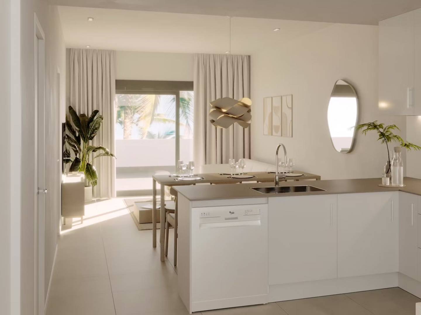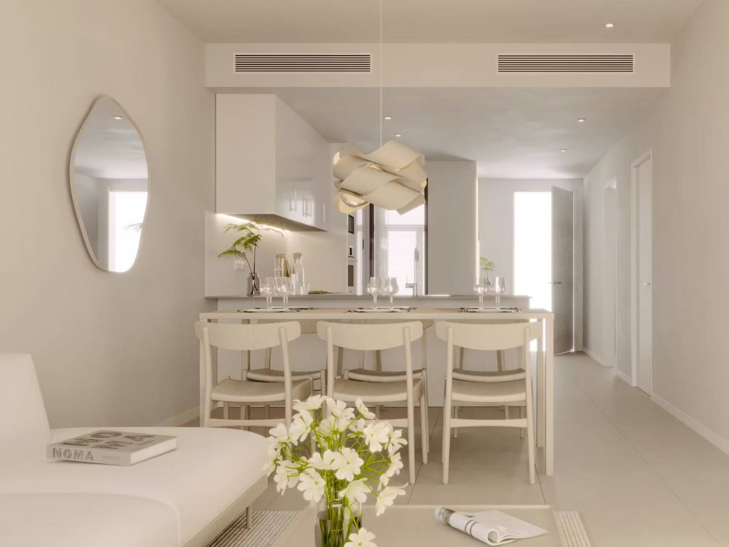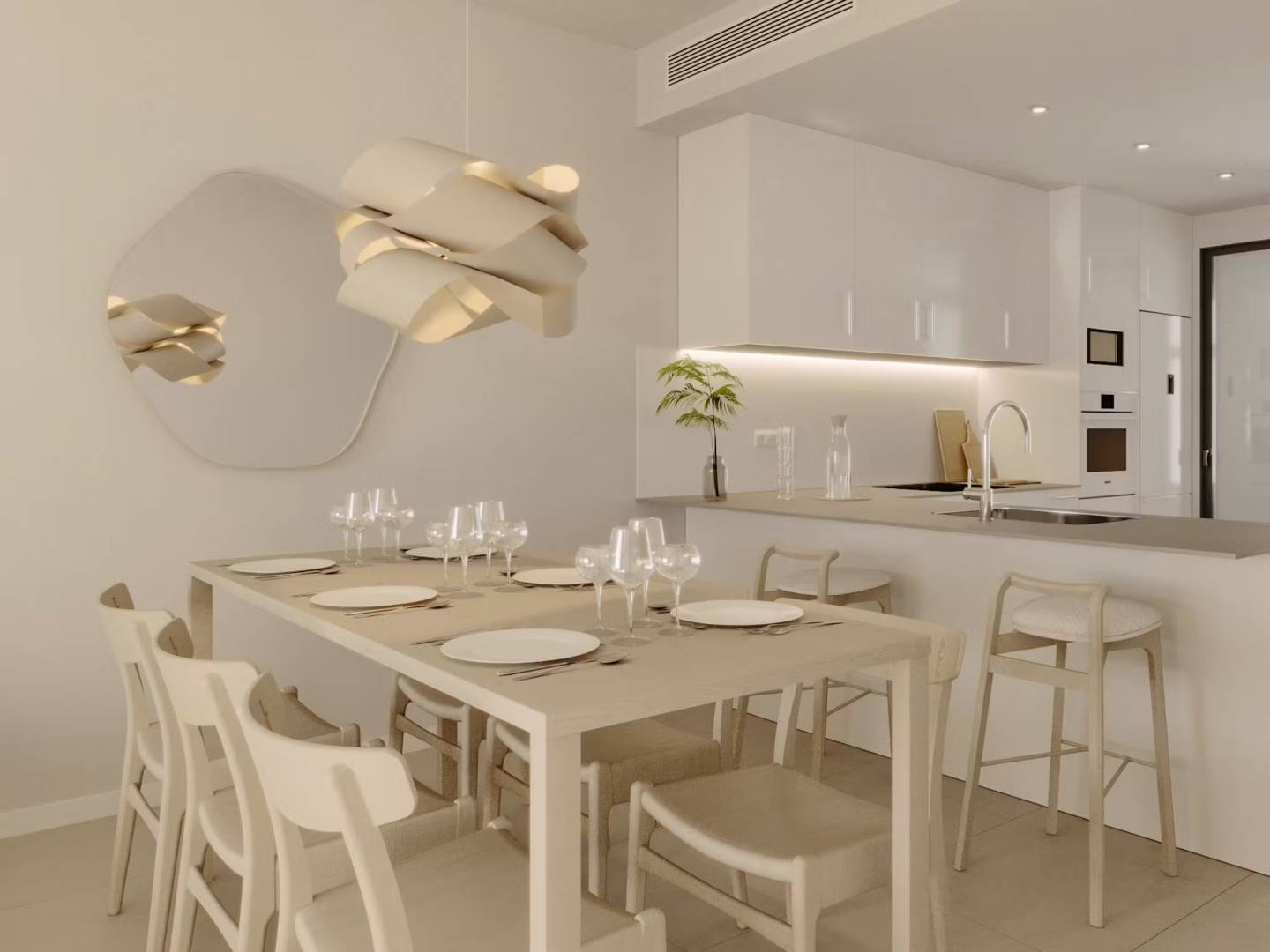 Wnętrza domów zaprojektowano z myślą o maksymalnym komforcie i funkcjonalności. Podłogi z gresu porcelanowego dodają elegancji i są łatwe w utrzymaniu. Wszystkie nieruchomości wyposażone są w klimatyzację, zapewniając przyjemną atmosferę przez cały rok. Nowoczesne urządzenia AGD ułatwiają codzienne życie, a wbudowane szafy zapewniają efektywne i uporządkowane przechowywanie. Układ domów zaprojektowano z myślą o optymalizacji przestrzeni, z przestronnymi strefami dziennymi, które płynnie łączą się z tarasami, tworząc płynny przepływ między przestrzenią wewnętrzną a zewnętrzną.
