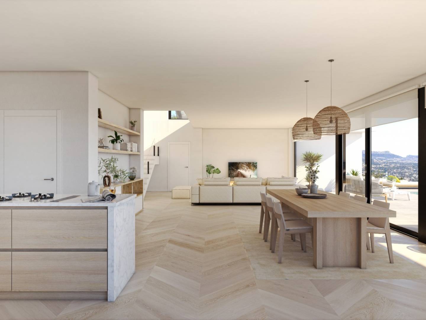 Jeśli istnieje willa, która naprawdę wyróżnia się designem i otwartymi przestrzeniami z zapierającymi dech w piersiach widokami na morze, to jest to właśnie ona. Najbardziej spektakularnym elementem jest imponujący salon z jadalnią, podzielony na trzy strefy: kącik telewizyjny, salon wypoczynkowy i jadalnię, połączoną z przestronną kuchnią za pomocą pięknej wyspy kuchennej. Wszystkie główne pomieszczenia wychodzą na teren zewnętrzny, w tym taras przy basenie i weranda – idealne miejsce na posiłki na świeżym powietrzu z widokiem na morze niemal przez cały rok.