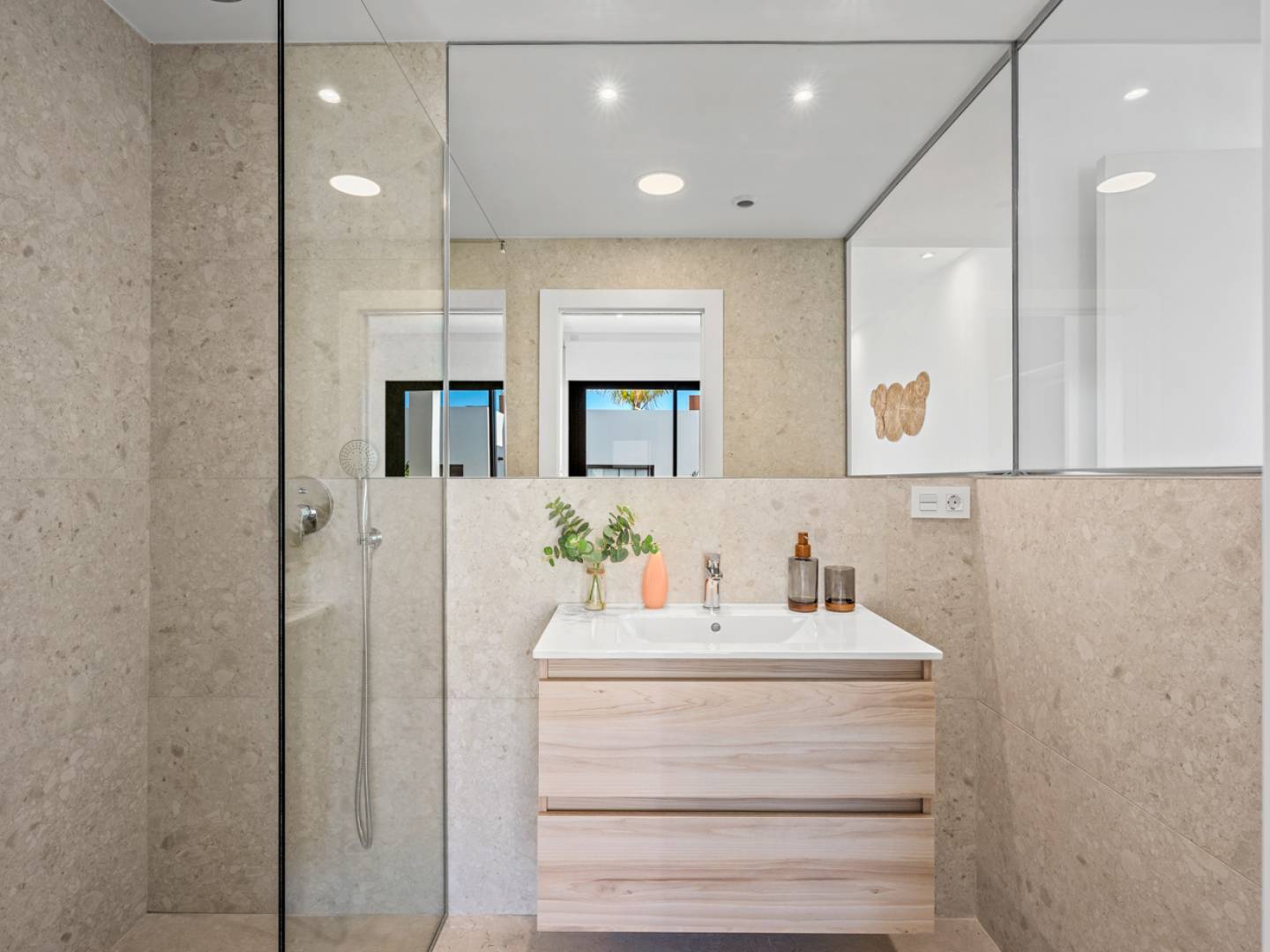 Wnętrza tych niezależnych domów zostały zaprojektowane z myślą o komforcie i stylu. Układ, obejmujący trzy sypialnie i dwie łazienki, został zoptymalizowany pod kątem przestronności i funkcjonalności. Podłogi z płytek porcelanowych dodają nowoczesnego charakteru i są łatwe w utrzymaniu. Domy wyposażone są w klimatyzację, zapewniającą komfort przez cały rok. Dodatkowo, wyposażone są w zintegrowane urządzenia AGD, wbudowane szafy, które maksymalizują przestrzeń do przechowywania, elektryczne rolety dla dodatkowej wygody oraz wideodomofon dla bezpieczeństwa.