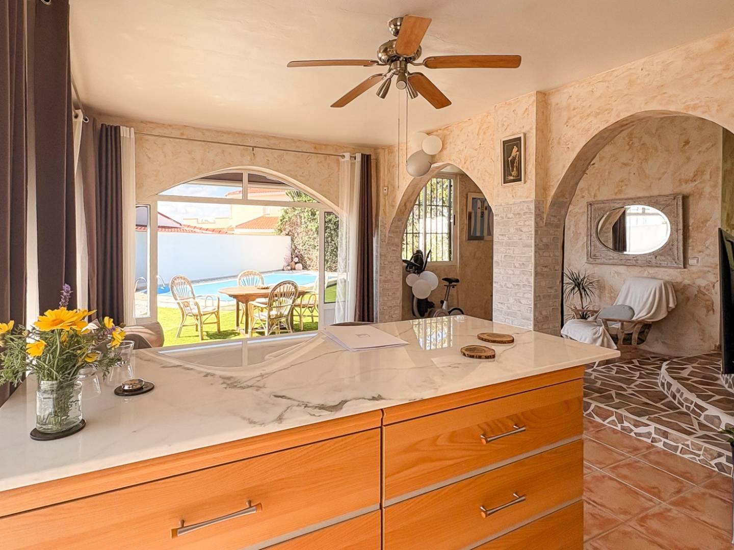 Ta wolnostojąca willa w Ciudad Quesada od razu urzeka typową śródziemnomorską fasadą, inspirowaną architekturą Ibizy . Bielone formy , organiczne linie i łagodne krzywizny , w połączeniu z naturalnymi, kamiennymi detalami , które nadają domowi autentyczności i struktury, czynią go obiektem prawdziwie wyjątkowym. Kompozycja architektoniczna emanuje ciepłem, tradycją i ponadczasową elegancją , podkreśloną przez takie elementy jak łuki, balustrady i stolarka w neutralnych barwach . Tworzy to harmonijną estetykę, umiejętnie łączącą styl rustykalny z nowoczesnym.