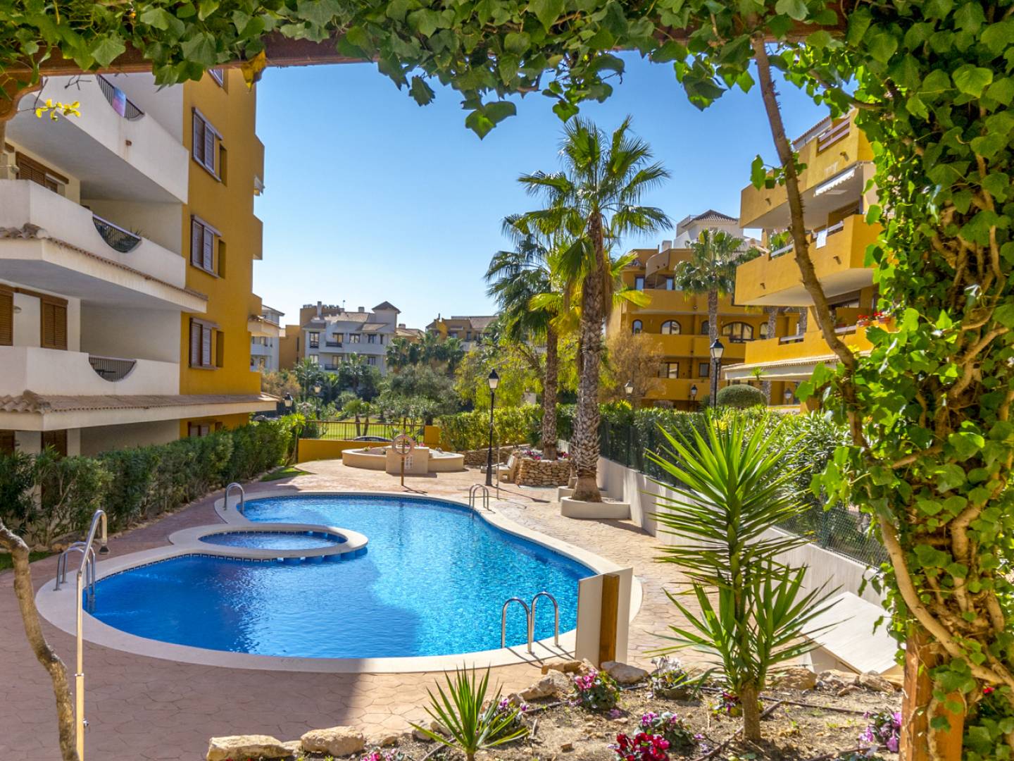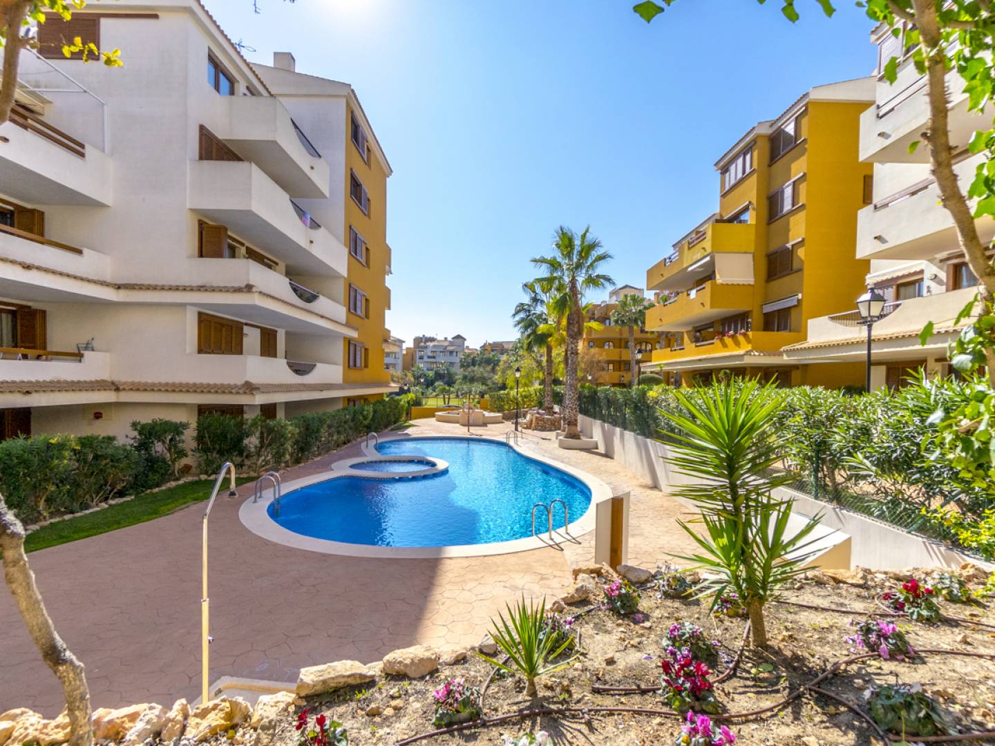 Odkryj ten uroczy apartament na parterze w Punta Prima , w ekskluzywnym kompleksie mieszkaniowym La Entrada . Ta nieruchomość idealnie łączy w sobie prywatność, przestrzeń i śródziemnomorską atmosferę . Apartament o powierzchni 128 m² oferuje dwie sypialnie , dwie łazienki , w pełni wyposażoną, oddzielną kuchnię oraz jasny salon z bezpośrednim dostępem do ogrodu. Absolutną atrakcją jest spektakularny, 40-metrowy prywatny taras – idealny do delektowania się uprzywilejowanym klimatem Costa Blanca , przyjmowania gości lub relaksu w eleganckim i kameralnym otoczeniu. Kompleks oferuje wysokiej jakości udogodnienia wspólne , w tym całodobową ochronę , zadbane trawniki i trzy wspólne baseny , z których jeden jest podgrzewany i czynny przez cały rok . Lokalizacja jest po prostu wyjątkowa: zaledwie 300 metrów od morza , w odległości spaceru od centrum handlowego Punta Marina oraz szerokiej gamy restauracji i udogodnień . Co więcej, w mniej niż 10 minut można dotrzeć do centrum handlowego Zenia Boulevard , szpitala Torrevieja i znanych pól golfowych, takich jak Villamartín , co sprawia, że nieruchomość ta jest idealną inwestycją w nieruchomości , zarówno jako główne miejsce zamieszkania, jak i lukratywny wynajem wakacyjny .