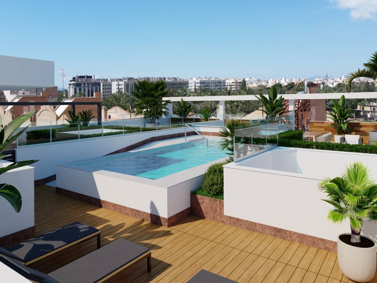 Además, el edificio cuenta con una espectacular terraza comunitaria con fantástica piscina, solárium y barbacoa, para que pueda disfrutar del buen clima mediterráneo. La fachada del edificio está recubierta de porcelánico y las terrazas tienen barandillas de cristal, lo que le da un toque moderno y elegante.