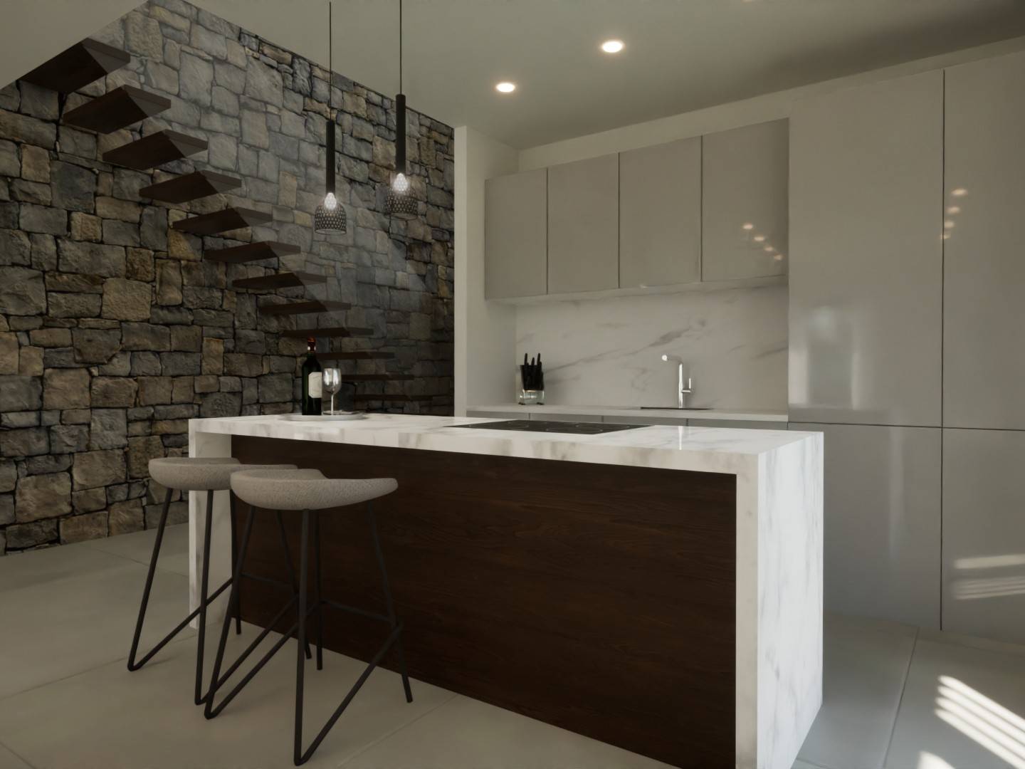 En la planta baja, encontrará un espacioso salón-comedor con grandes ventanales que se abren a un acogedor porche y zona ajardinada, una moderna cocina con una isla abierta que permite disfrutar de agradables veladas con amigos mientras se prepara una exquisita cena, una habitación doble con baño en suite y vestidor, y un aseo de cortesía para visitas. Una elegante escalera de madera y barandilla de cristal conduce a la planta superior.