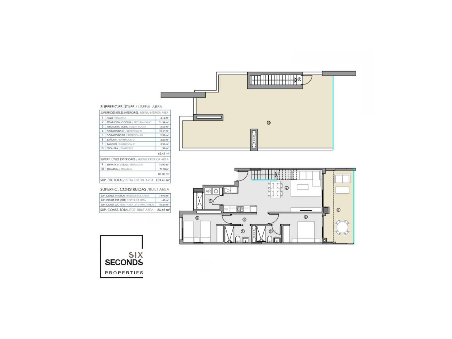 Este ático se ofrece con 2 dormitorios y 2 baños, con cocina abierta y salón-comedor, con terraza y muy amplio solárium 71 m2.