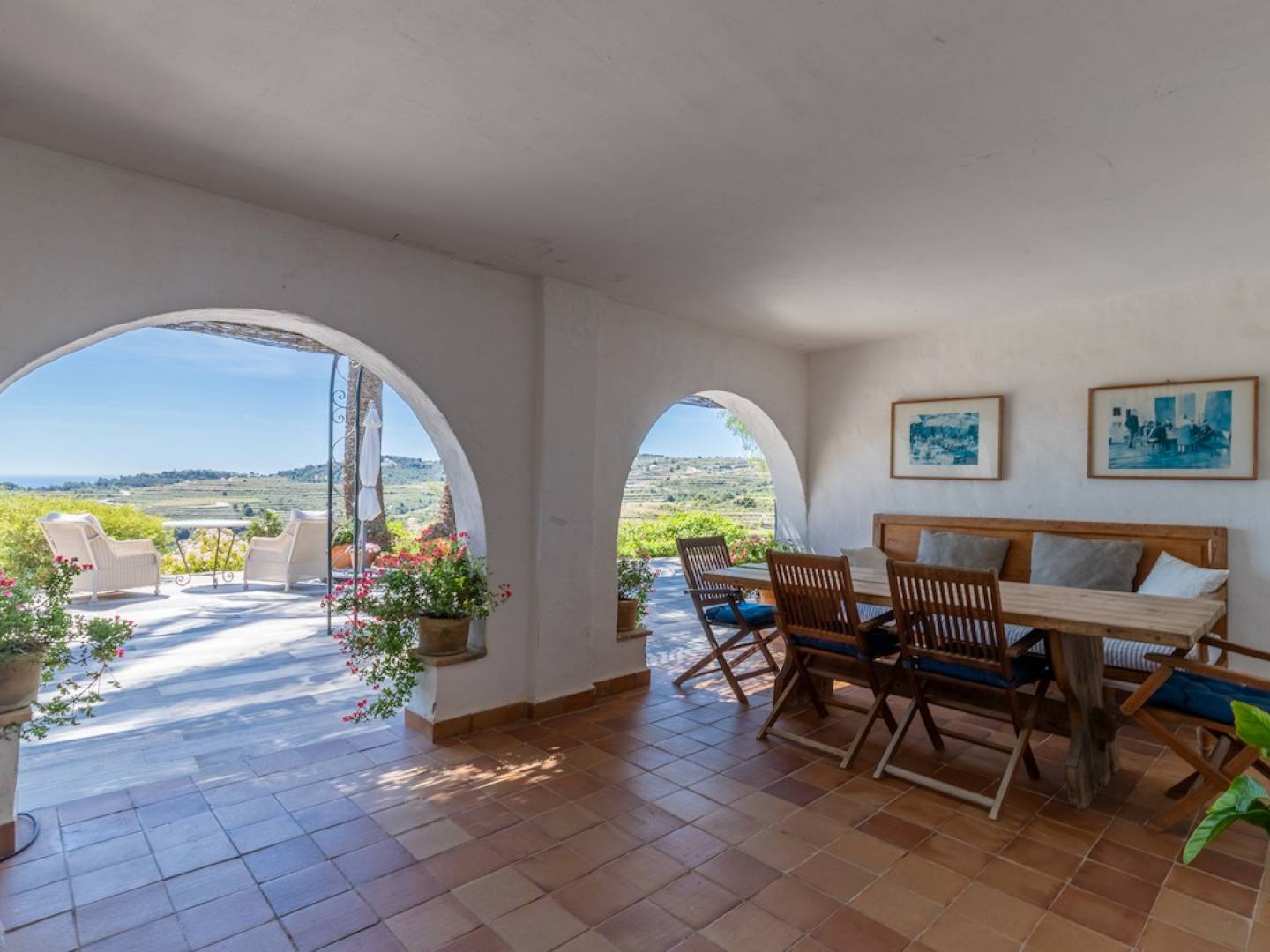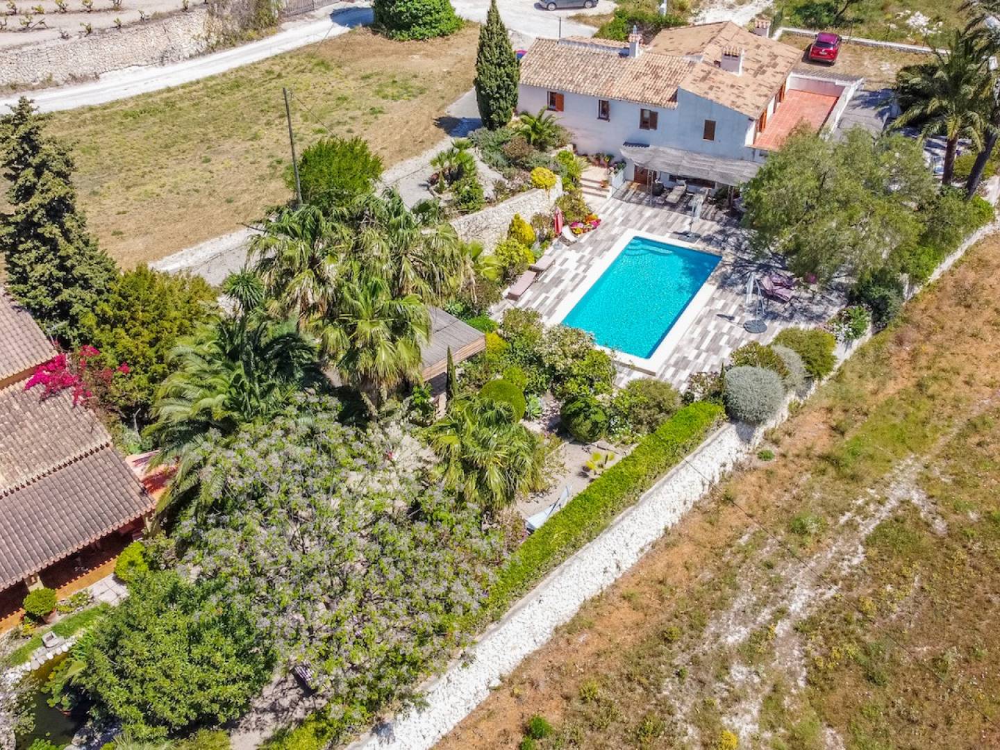 Las vistas, como si de una postal se tratase, son abiertas hacia los campos verdes de viñedos con el mar y el Cap d'or de Moraira al fondo, construida sobre la ladera de una colina con orientación sur oeste, que nos garantiza el disfrute del clima templado de la zona, estando protegidos del viento del norte y con el viento de sur que es aire acondicionado natural de la zona en la temporada de verano.