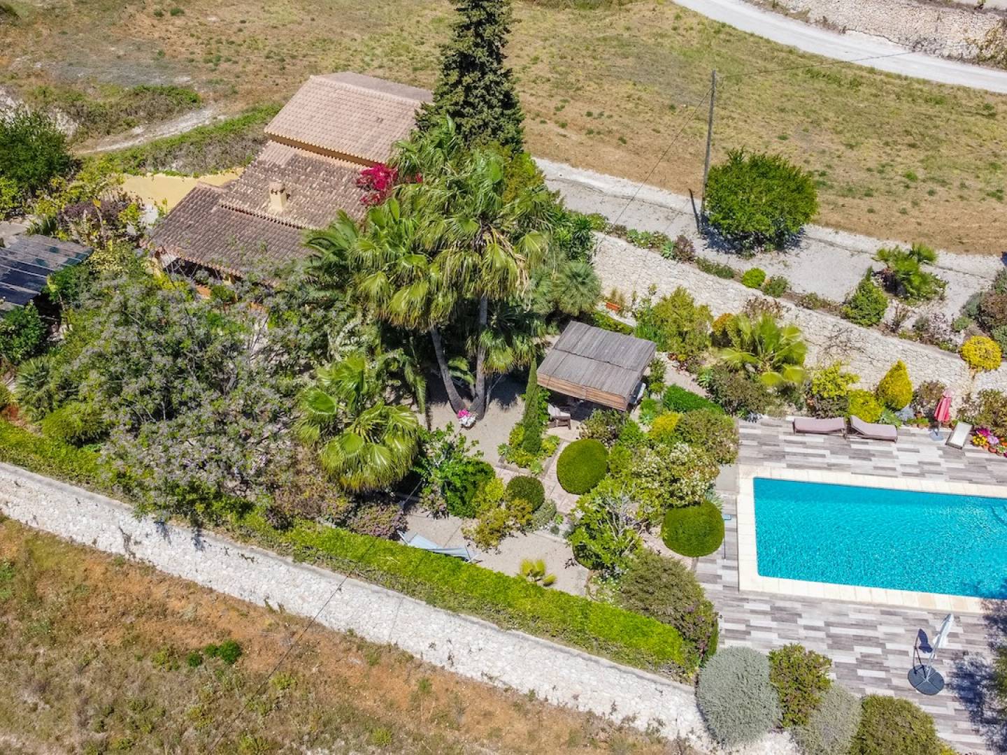 Entremedias de las 2 construcciones está el jardín, con todo tipo de plantas maduras y una zona de relax a la sombra de las palmeras que nos lleva a la zona de baño con una amplia terraza con pavimentos antideslizantes de más de 200 m2, que rodea la piscina.
