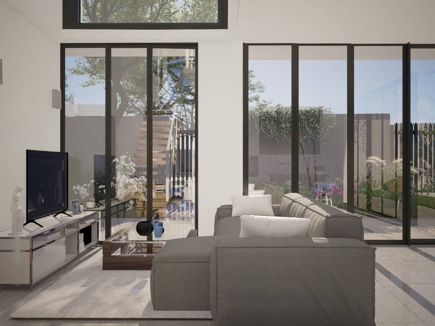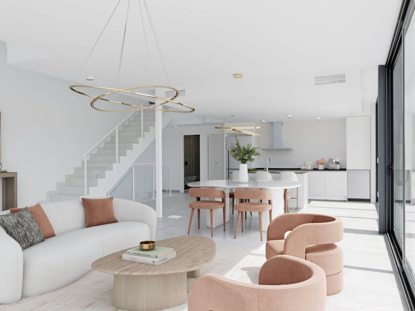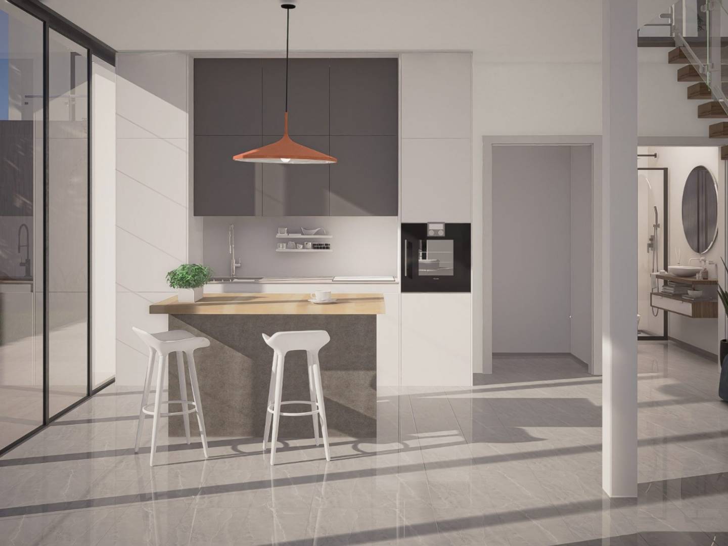 La cocina tiene una distribución personalizable. La vivienda posee un dormitorio en suite con vestidor. Se caracteriza por los enormes ventanales, cuyo objetivo principal es captar la mayor cantidad de luz natural posible, logrando así un ambiente confortable en la vivienda. Tiene una distribución en doble altura, este modelo se construye en parcelas desde 395 m2. Junto a un sinfín de servicios como centro comercial, escuela, servicios médicos, bancos, etc...