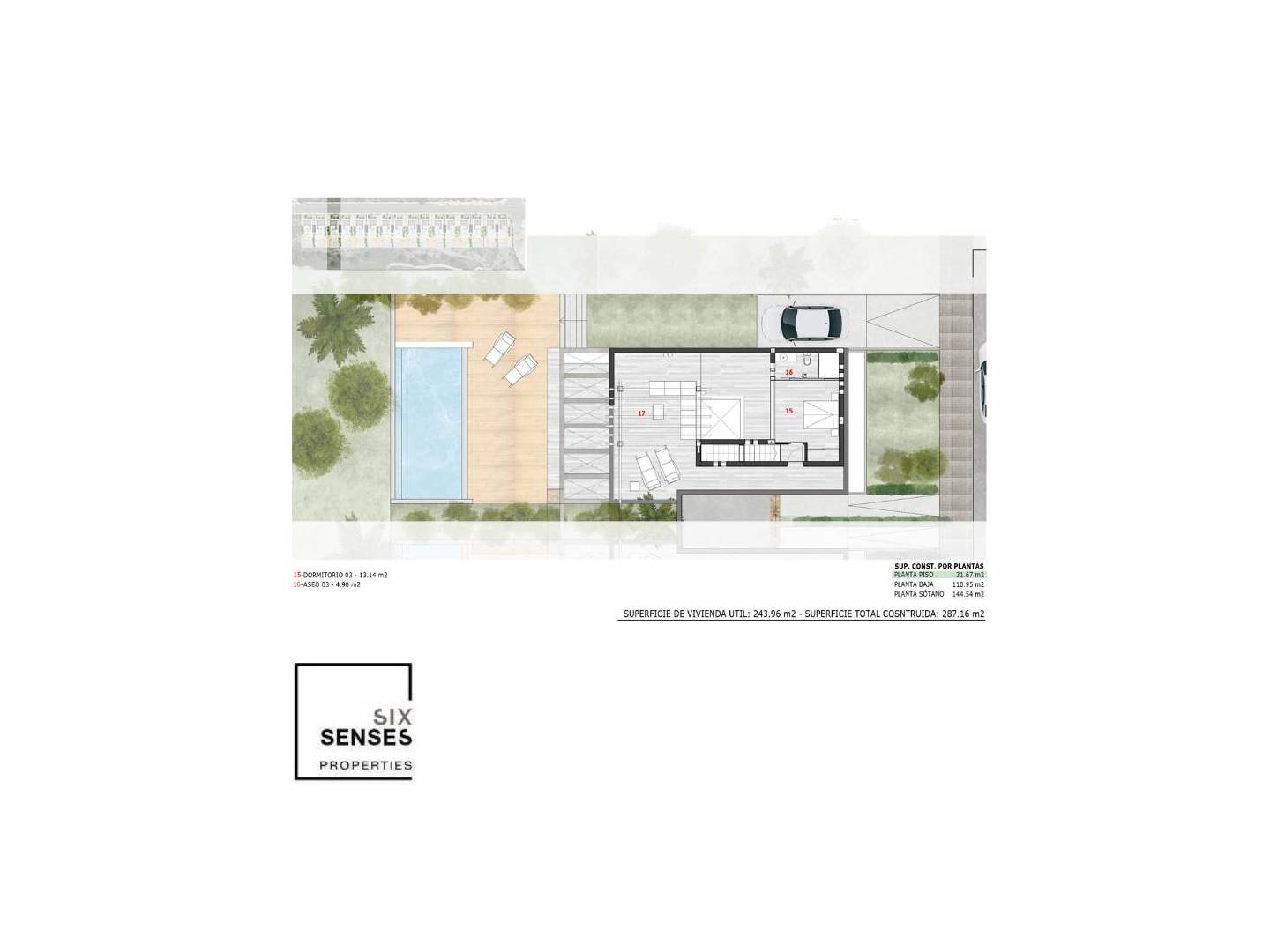 En cuanto al paisajismo, tanto el área exterior (entrada) como el área interior (piscina) cuentan con césped artificial, plantas mediterráneas y árboles, todo ello integrado en un sistema de riego por goteo con activación wifi. Esto garantiza un jardín sostenible y de bajo mantenimiento que se adapta perfectamente al entorno y proyecta una imagen de colores neutros que se integran armoniosamente en el paisaje circundante.
