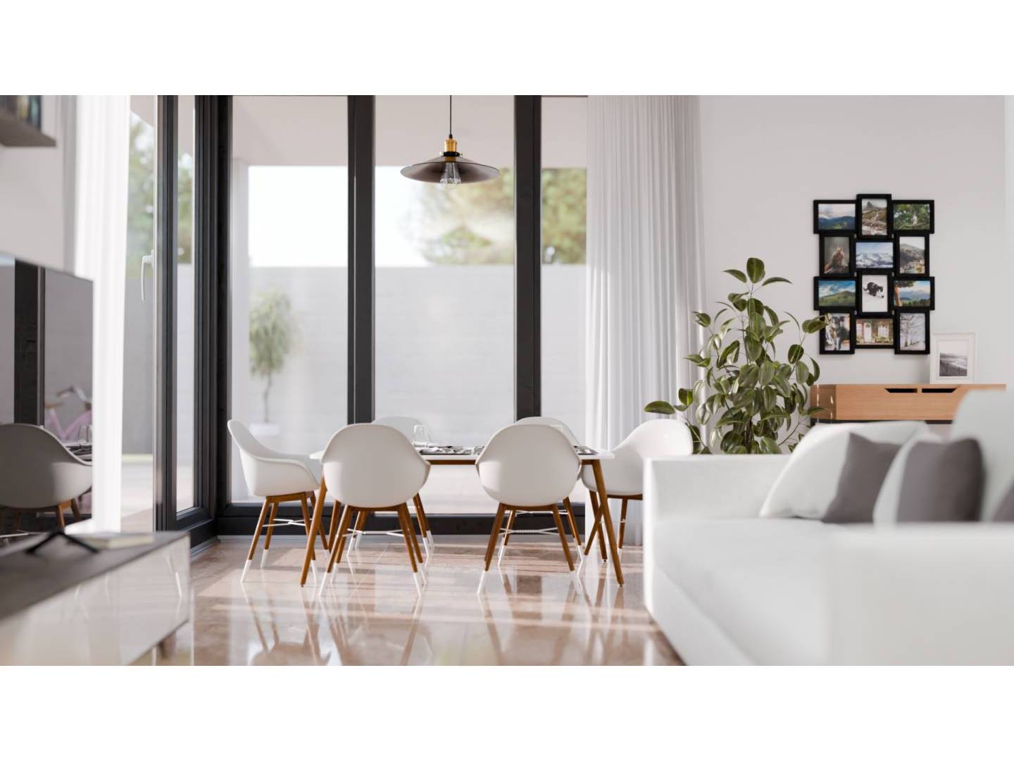 La construcción se realiza en parcela 295 m2, cuenta con La vivienda se distribuye en dos plantas, con 4 dormitorios, 3 baños y una cocina americana incorporada en el salón, una amplia cocina americana integrada en salón de 46 m2, 1 dormitorio en planta baja y 3 en la primera planta, con 3 baños. Existe la posibilidad adicional de construir una piscina privada en la parcela.