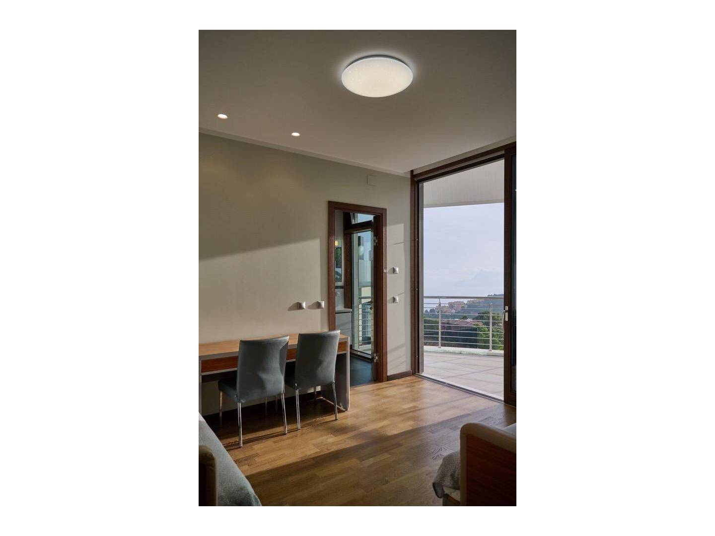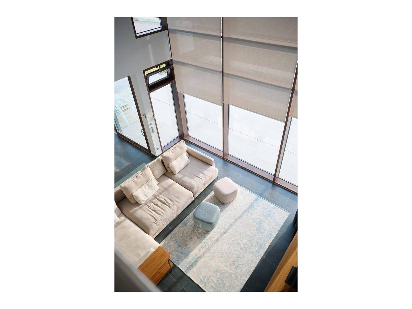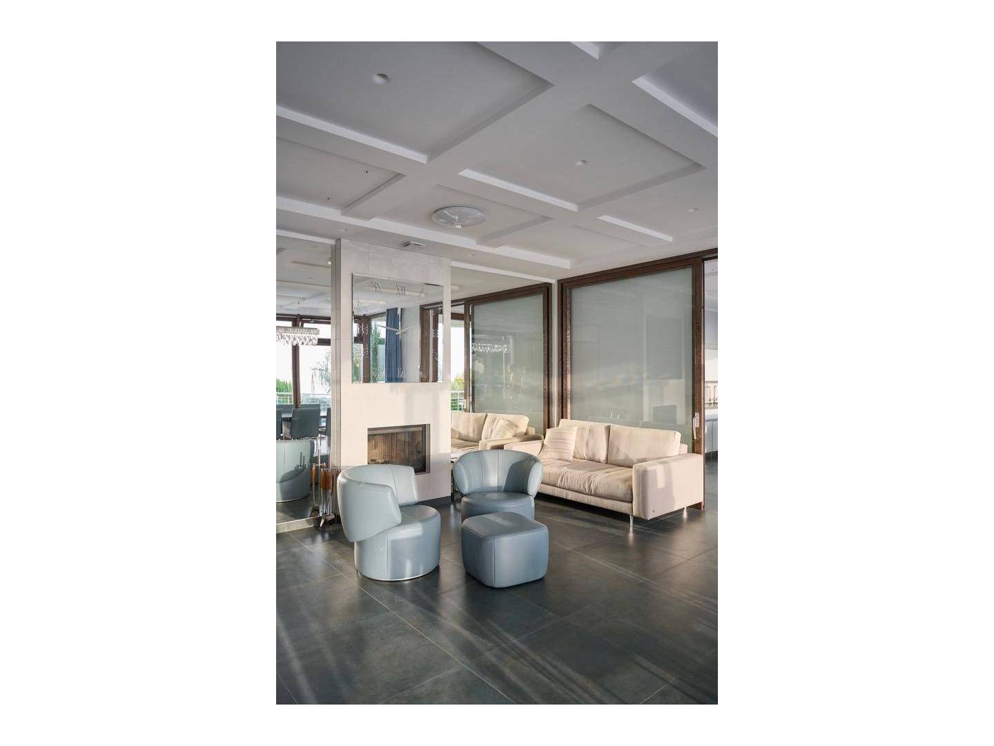 Una enorme terraza de casi 300 m2 se extiende frente a la villa, acogiendo una piscina climatizada de 16 metros de largo. Una cubierta protectora controlada eléctricamente permite disfrutar de la piscina en todas las estaciones del año. El revestimiento de piedra natural de color beige claro KALISA en la fachada y otros elementos añade un toque de naturalidad y elegancia a la estructura.