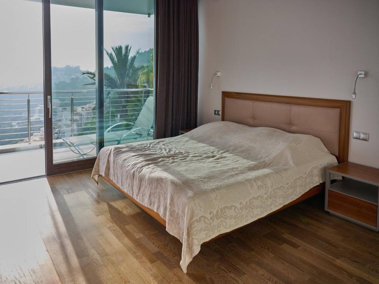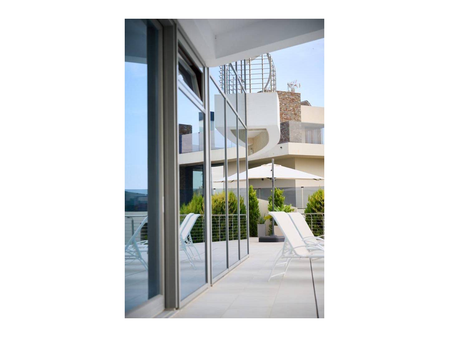 La fachada principal, con sus 24 metros de longitud y 7 metros de altura, es una verdadera obra maestra. Realizada con estructuras de madera-aluminio de alto rendimiento térmico, combina elegancia con funcionalidad. Los cristales tintados de color verde-azul de la prestigiosa empresa francesa Saint-Gobain reflejan el entorno circundante, creando una conexión armónica con el mar, las montañas y el cielo.
