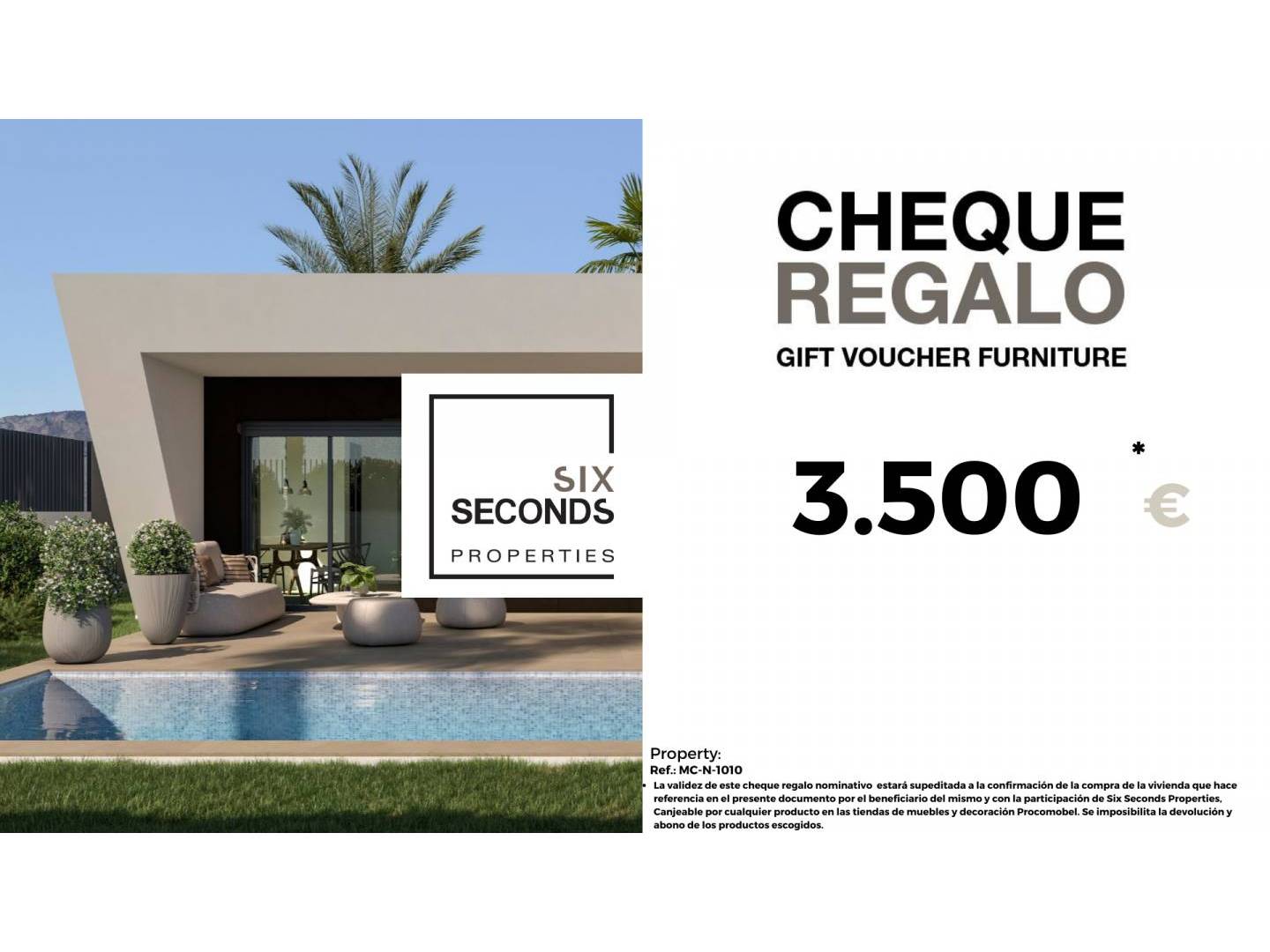 En Six Seconds Properties te ayudamos a convertir tu nueva propiedad en la casa de tus sueños, regalándote un cheque regalo de 3.500€ en mobiliario y una visita técnica de la vivienda, donde nuestro equipo técnico te aconsejará sobre las posibilidades de mejora de la vivienda. Totalmente gratis!!