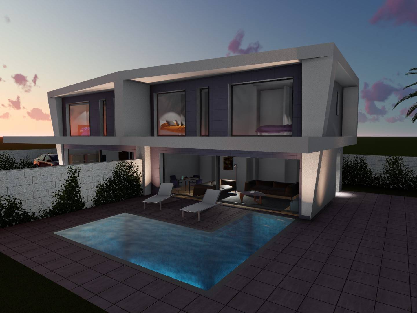 Villa semi pareada en doble altura con posibilidad de hasta 4 dormitorios, con cocina americana, independiente o en salón. Tiene gran terraza y porche frontal. También cuenta con con sistema de energía renovable con calentador aerotérmo incluido. La vivienda tiene una opcion de tener una encantadora piscina privada de estilo moderno.