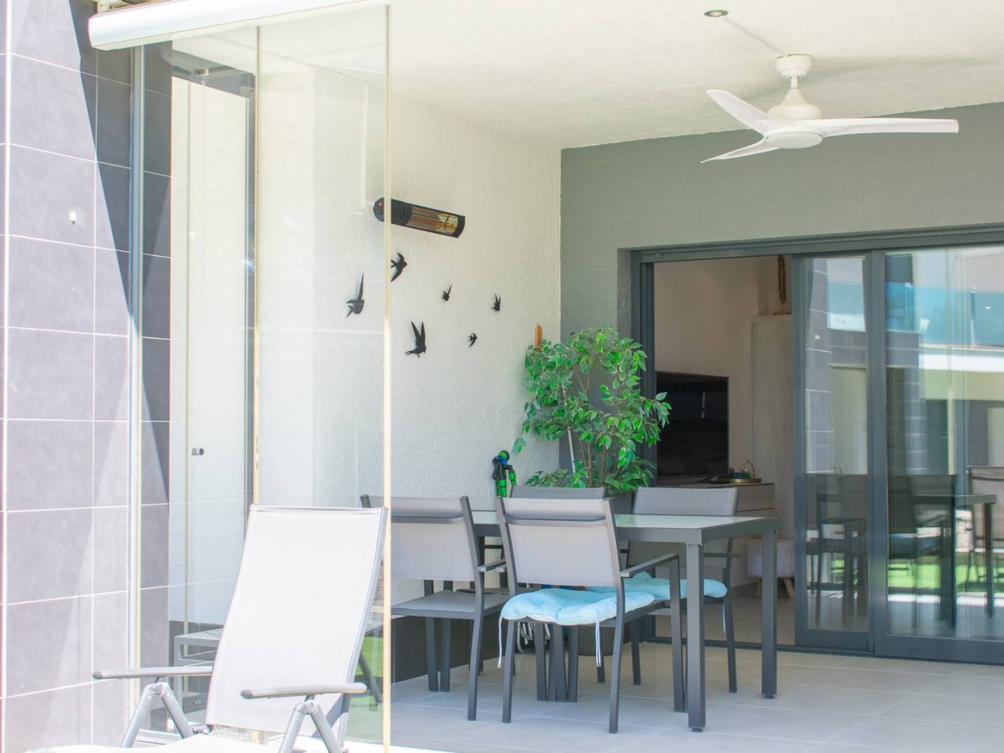 La terraza, accesible desde la sala de estar y el dormitorio principal, te invita a relajarte al sol o disfrutar de una cena al aire libre, con la flexibilidad de abrir o cerrar parte de ella según tus necesidades.