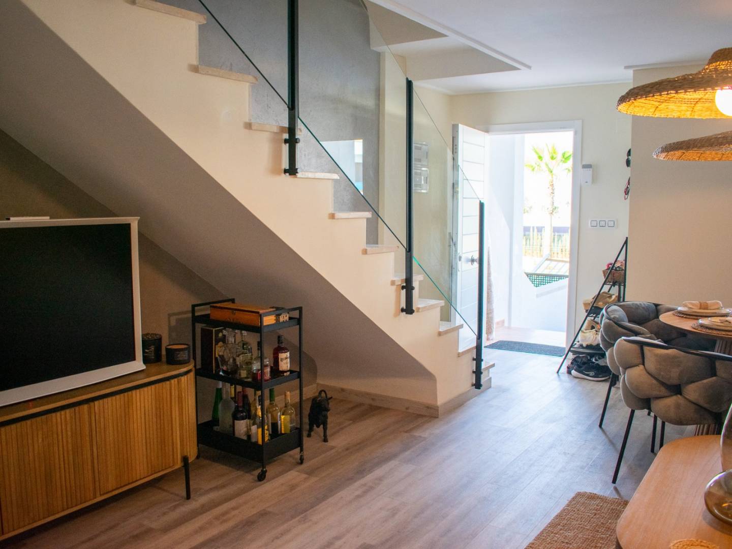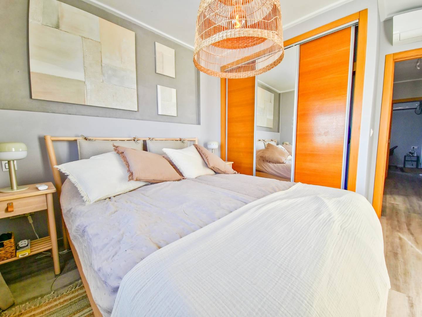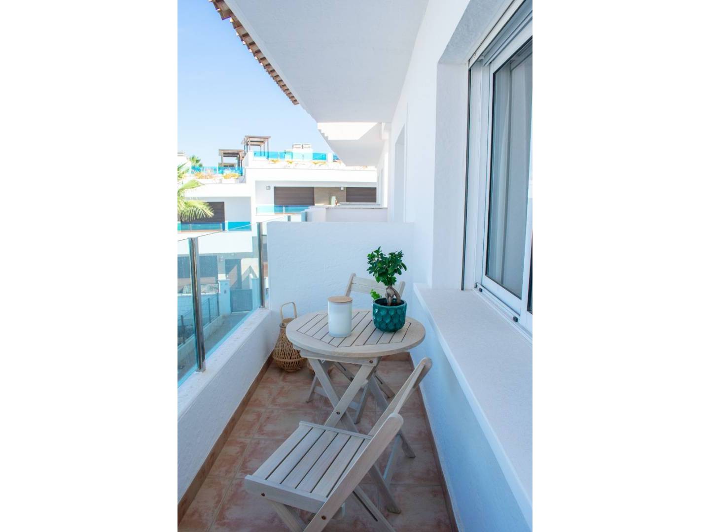 La vivienda se distribuye en tres amplios dormitorios y dos baños completos, lo que la convierte en una opción ideal para familias o quienes buscan más espacio. El salón es luminoso y cómodo, perfecto para el relax, mientras que la cocina está equipada para facilitar la preparación de comidas. También cuenta con un patio, varias terrazas y un amplio solárium, ofreciendo múltiples espacios al aire libre para disfrutar del clima y las vistas.