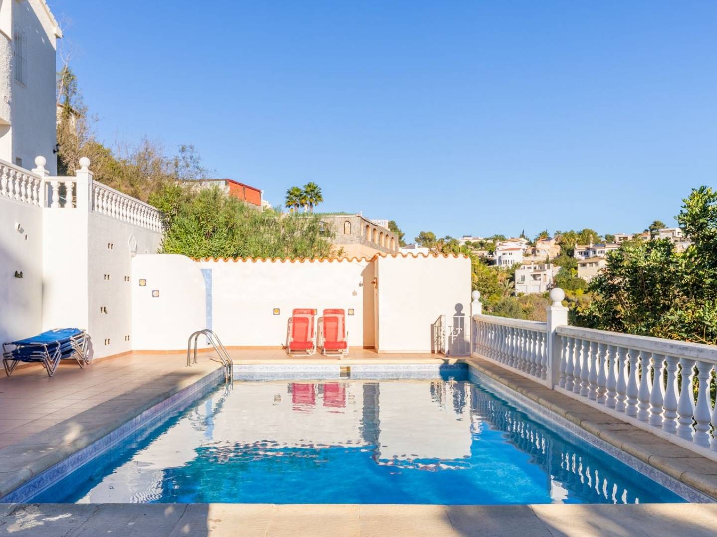 El exterior es un verdadero paraíso mediterráneo. Una piscina de 8x4 metros rodeada de vegetación, un jardín exuberante, y una zona de comedor al aire libre cubierta por un toldo crean el escenario ideal para disfrutar del clima y el estilo de vida de la Costa Blanca.