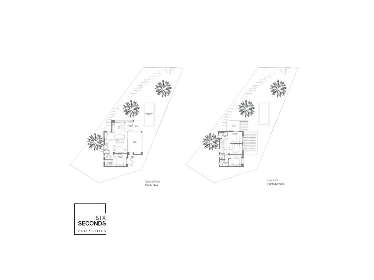 La planta baja ofrece un dormitorio doble con baño en suite y terraza privada, junto con zonas de estar y comedor de planta abierta que se conectan con terrazas amplias y una pérgola para disfrutar de comidas al aire libre. La primera planta alberga tres dormitorios, incluyendo la suite principal con baño en suite y terraza privada, ideal para relajarse en el entorno tranquilo.