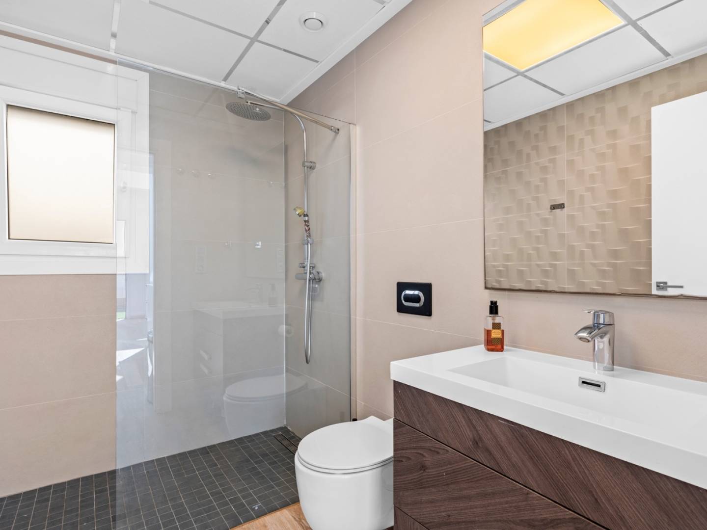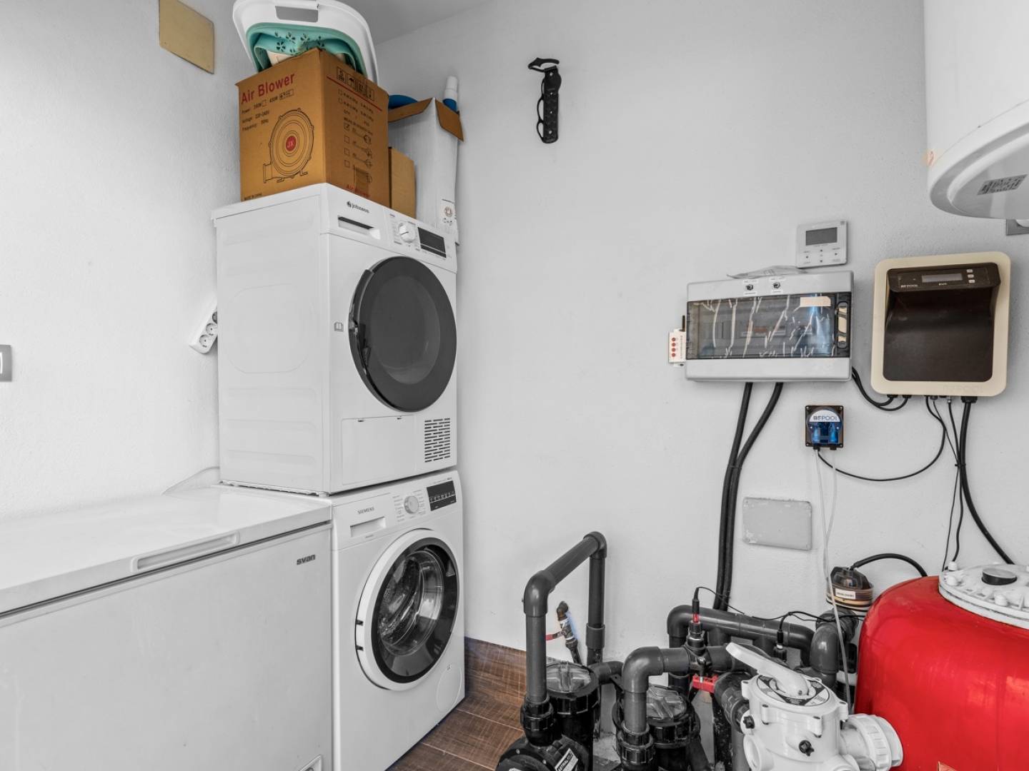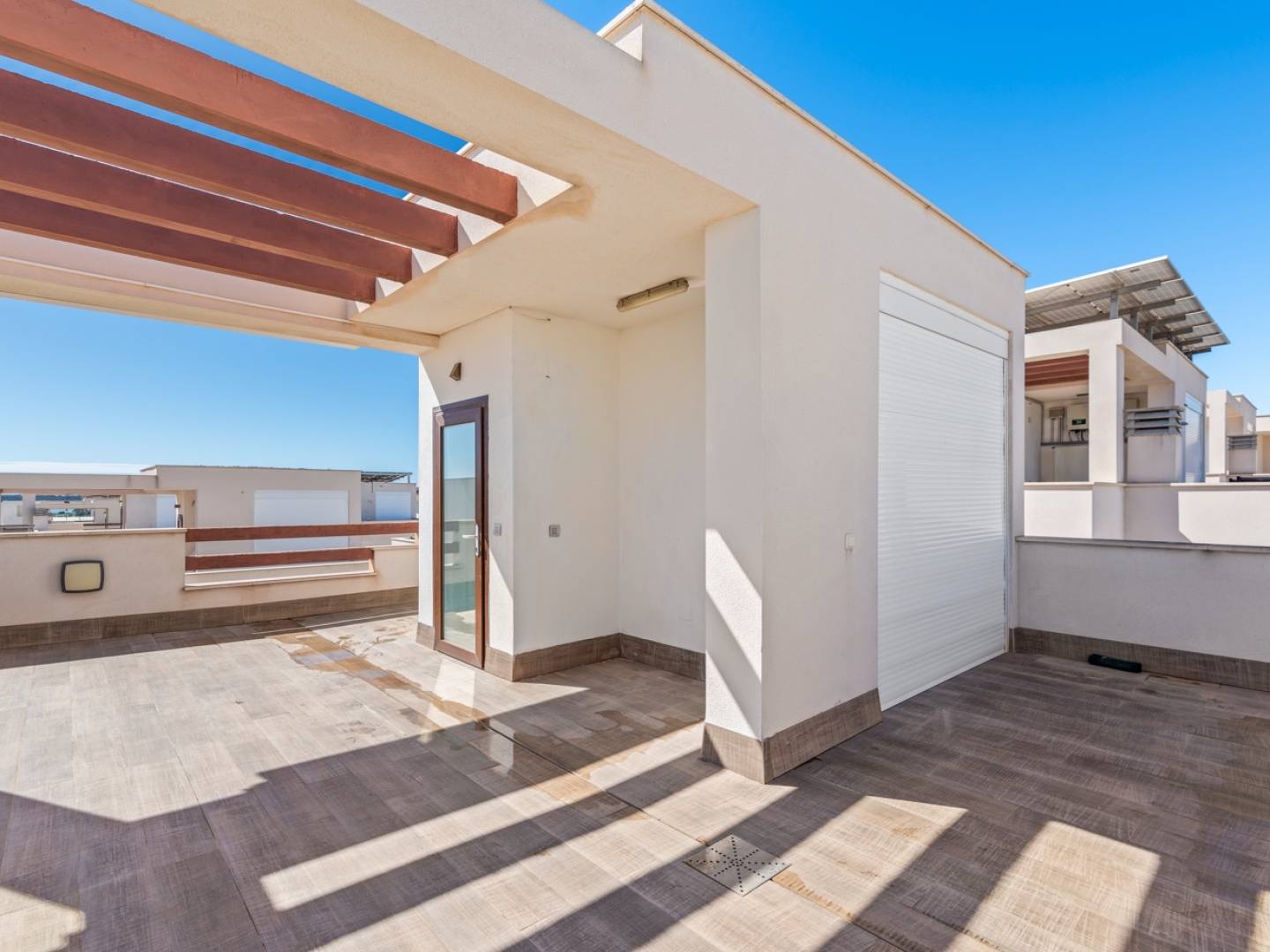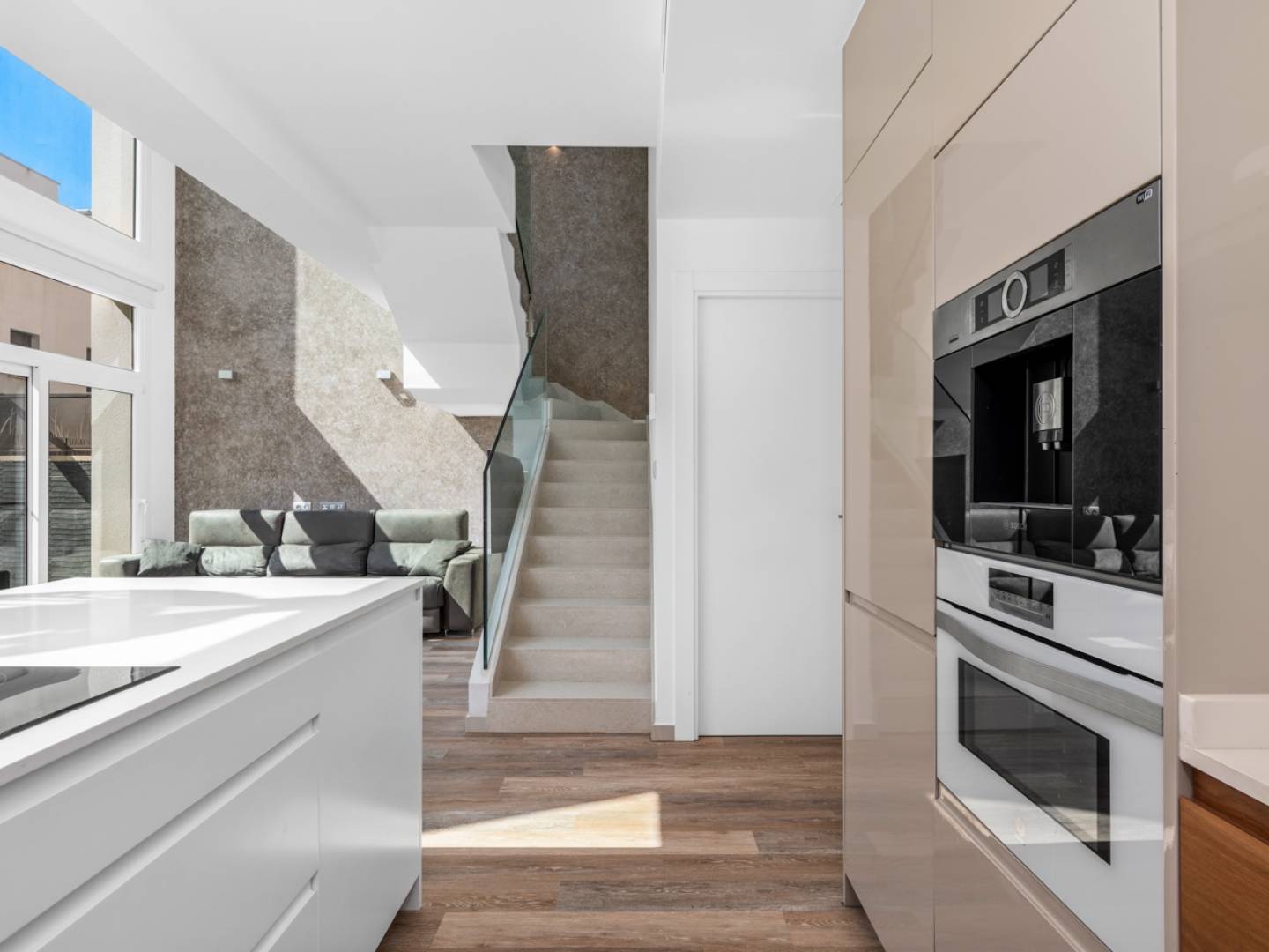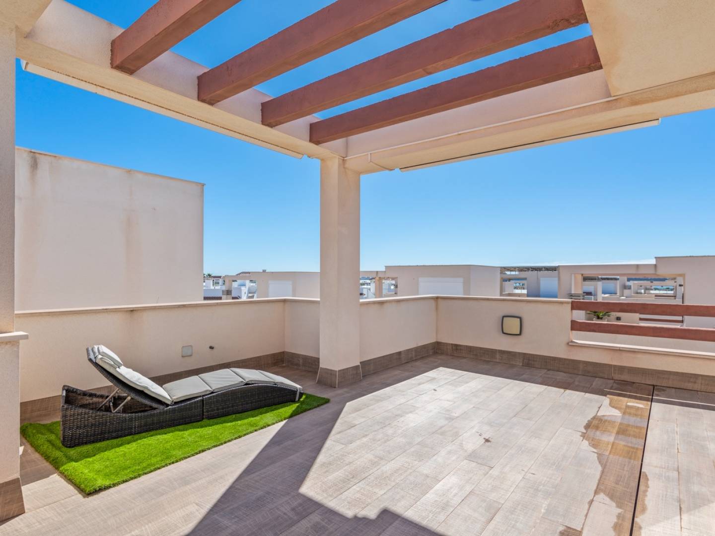 Ubicada en un residencial de 50 viviendas independientes, esta propiedad ofrece una distribución funcional y espacios cómodos. Construida en 2018, cuenta con una superficie de 101 m² en una parcela de 182 m², con tres dormitorios y tres baños. En la planta baja, dispone de un salón con cocina integrada, un baño completo, un dormitorio y una zona de lavandería equipada con lavadora y secadora de 8 kg. En la primera planta, se encuentran dos dormitorios adicionales, uno de ellos con baño en suite y acceso a una terraza privada. La planta superior cuenta con un solárium con espacio para una cocina exterior y la instalación de un jacuzzi. El exterior incluye una piscina privada de agua salada con cubierta automática, un jardín de césped artificial y un espacio de aparcamiento dentro de la parcela. La vivienda está equipada con un sistema de calefacción y refrigeración por aerotermia, dos toldos automáticos y una vela solar para sombra. Entre sus características adicionales, cuenta con electrodomésticos de cocina, cafetera súper automática Bosch con Wi-Fi, estores automáticos, mosquiteras en ventanas y puertas, mamparas de cristal en las duchas, sistema de seguridad interior y exterior y caja fuerte. La propiedad se encuentra en una zona tranquila con buen acceso a núcleos urbanos cercanos. Para más información o para concertar una visita, contáctenos.