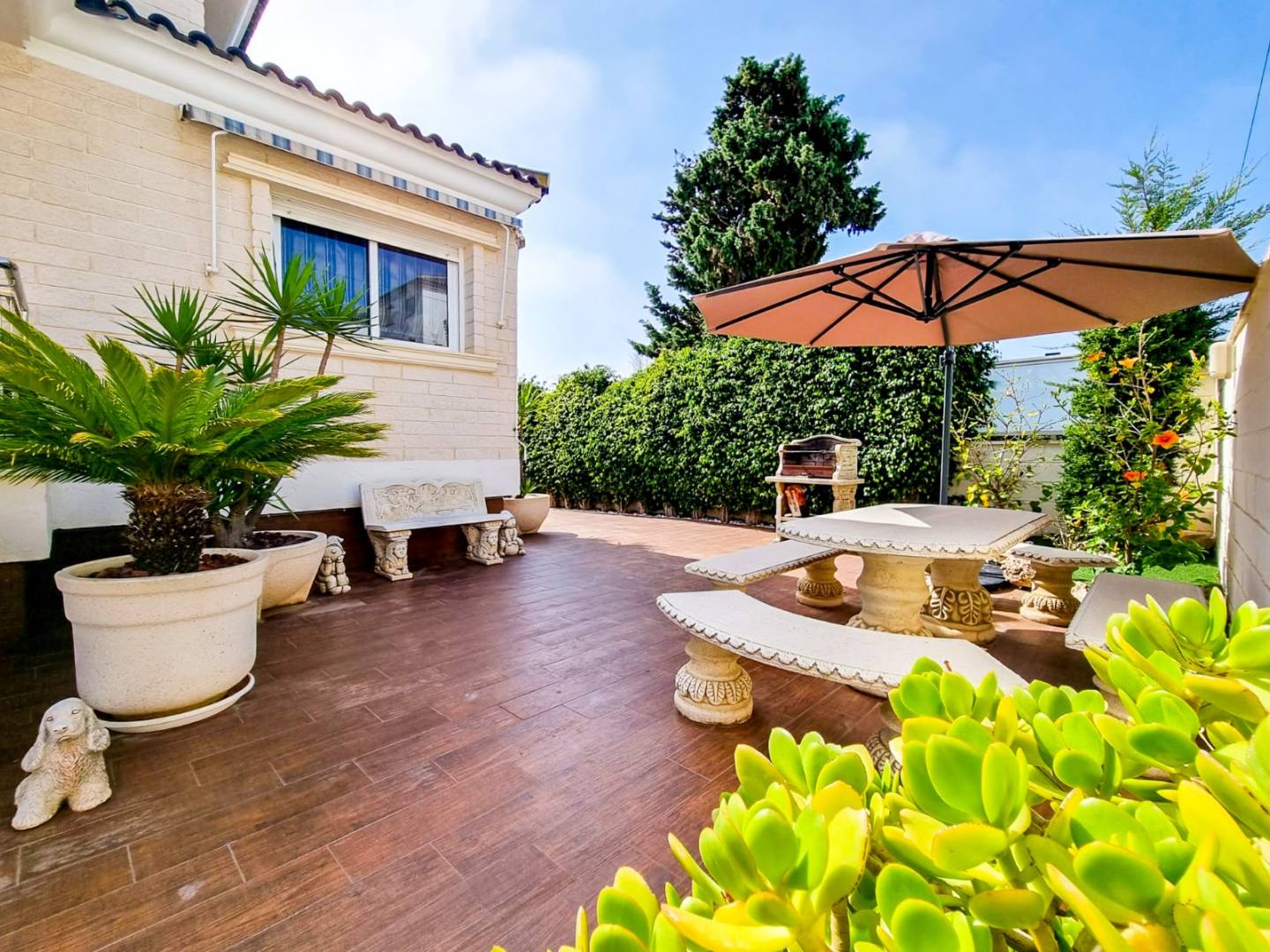 Ubicada en una amplia parcela, el espacio exterior es igualmente impresionante. Varias zonas de descanso ofrecen espacio para relajarse o entretenerse, mientras que la piscina privada invita a refrescarse y tomar el sol. Hay amplio aparcamiento para varios vehículos y la propiedad pertenece a una comunidad bien cuidada que ofrece jardín y pista de tenis compartidos.