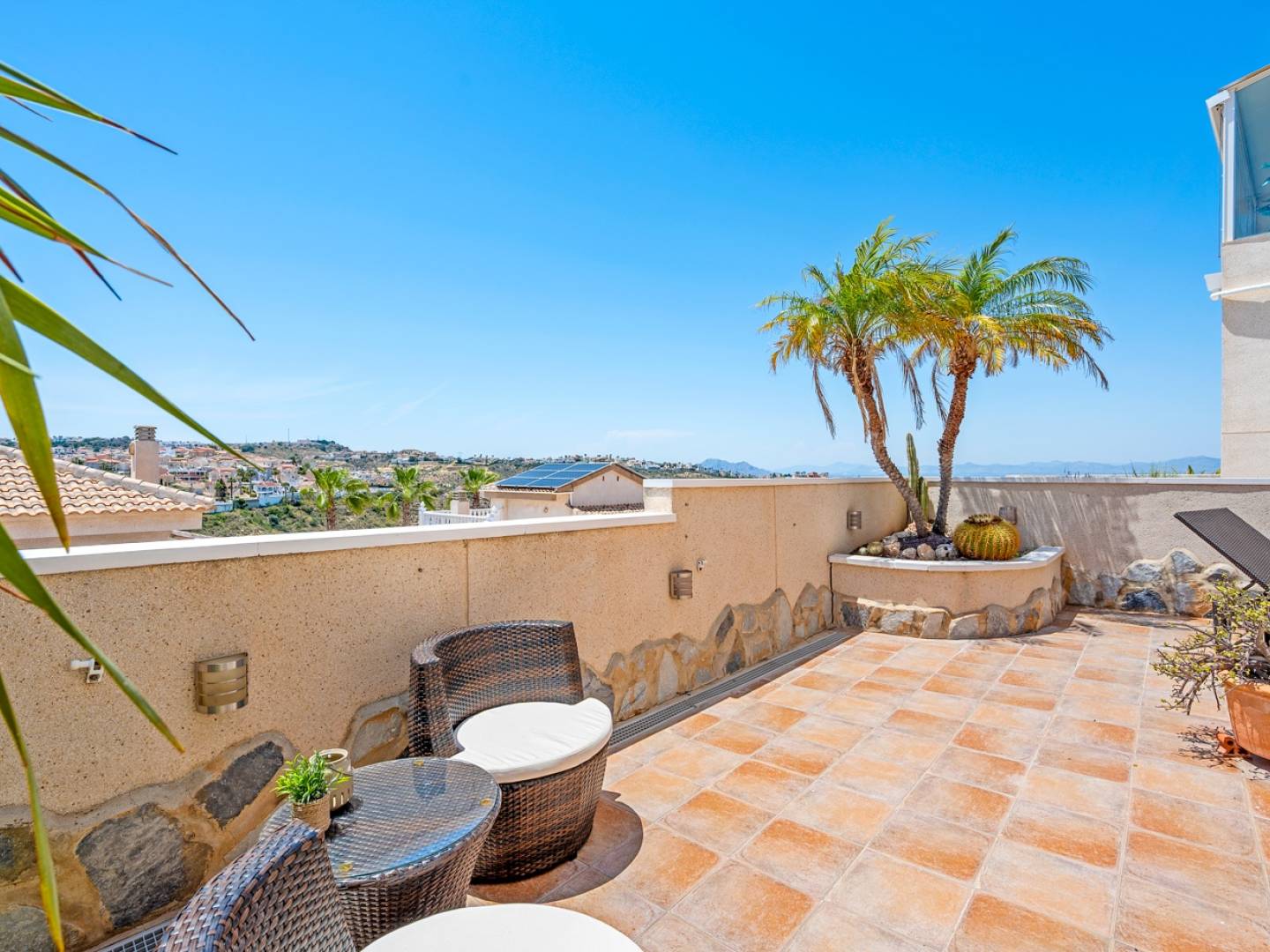 En la primera planta, dos dormitorios adicionales —uno de ellos con balcón privado— comparten un baño completo, y en la planta superior, un espectacular solárium le regala vistas panorámicas para momentos de calma o tertulias al atardecer.
