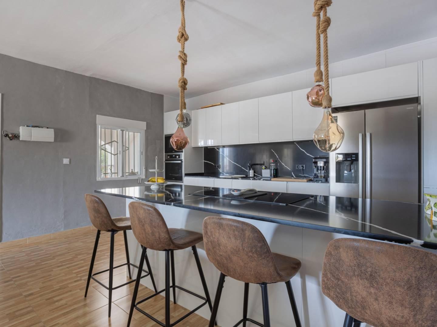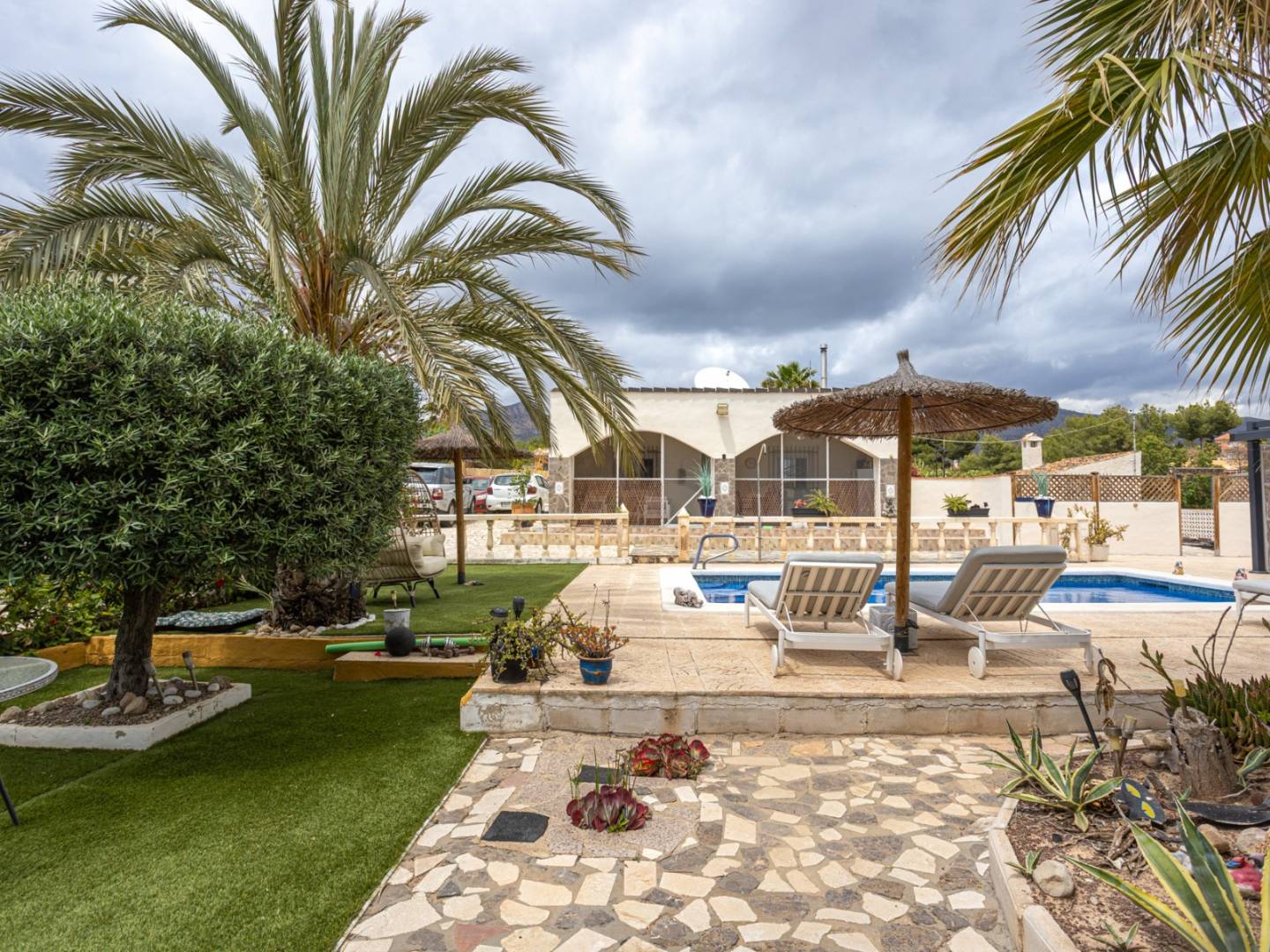 La vivienda principal, con 117 m², impresiona por su amplitud y luz natural. Dispone de 3 dormitorios (uno en suite), 2 baños, cocina abierta integrada en un acogedor salón y un porche cubierto con vistas panorámicas de más de 4.000 km², que alcanzan hasta Alicante y el mar. El exterior alberga un cuidado jardín con árboles, una piscina iluminada de 8x4 metros, ducha solar y zonas de relax.