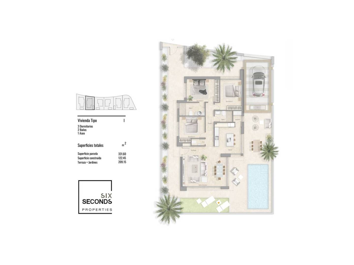Descubra el placer de vivir en una de las 6 villas. Con una arquitectura elegante y materiales de alta calidad, esta villa le ofrece 3 amplios dormitorios, 2 baños completos y 1 aseo, cocina de diseño completamente equipada, suelos radiantes en los baños, persianas eléctricas y aire acondicionado para su máximo confort. Disfrute de un jardín privado con sistema de riego, piscina de 6x3 metros y aparcamiento en parcela. Cuatro de las villas se distribuyen en una sola planta, mientras que dos se desarrollan en dos niveles, ofreciendo opciones para todos los estilos de vida.