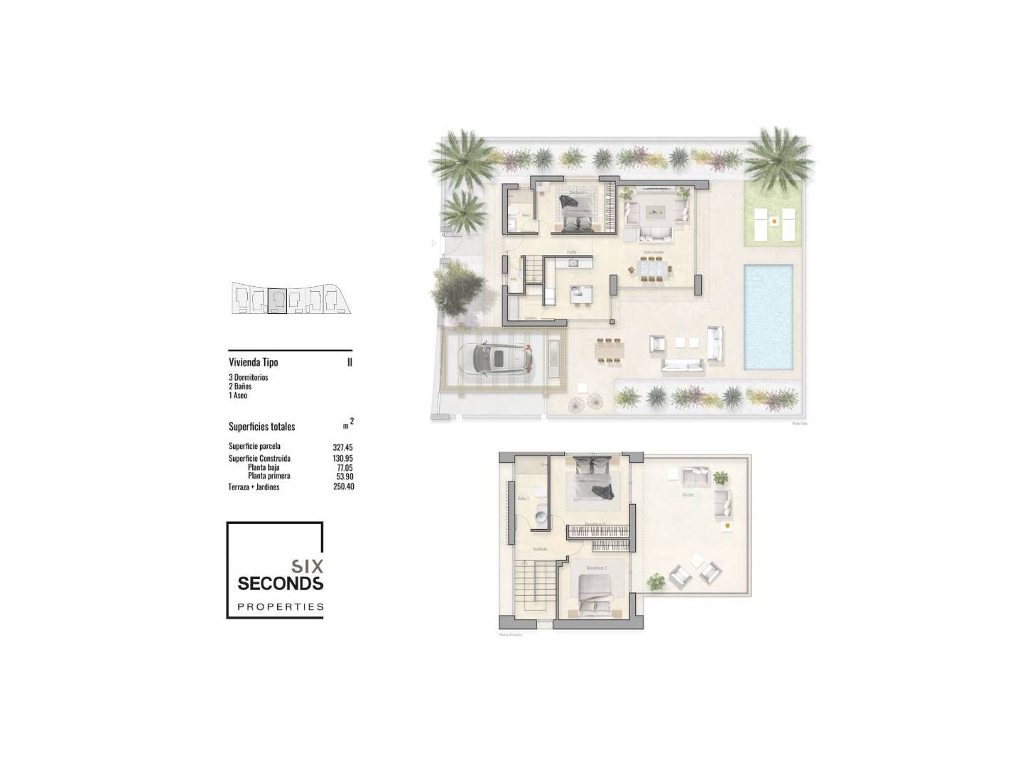 Descubra el placer de vivir en una de las 6 villas. Con una arquitectura elegante y materiales de alta calidad, esta villa le ofrece 3 amplios dormitorios, 2 baños completos y 1 aseo, cocina de diseño completamente equipada, suelos radiantes en los baños, persianas eléctricas y aire acondicionado para su máximo confort. Disfrute de un jardín privado con sistema de riego, fantástica piscina de 6x3 metros y aparcamiento en parcela. Cuatro de las villas se distribuyen en una sola planta, mientras que dos se desarrollan en dos niveles, ofreciendo opciones para todos los estilos de vida.