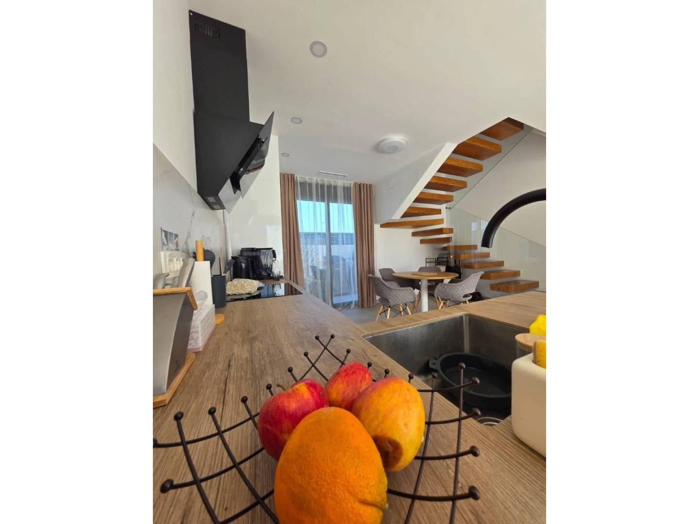 La planta superior alberga dos dormitorios dobles con armarios empotrados y un elegante baño con ducha italiana. Desde aquí se accede a un solárium privado, ideal para disfrutar del sol, las vistas panorámicas y el clima privilegiado del Mediterráneo.