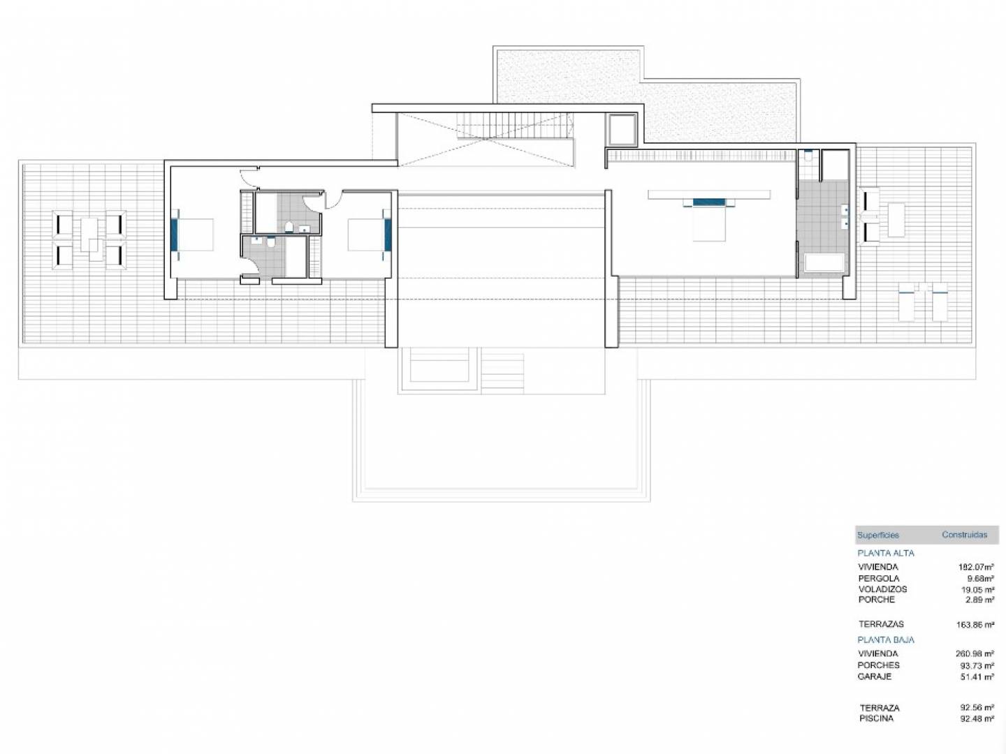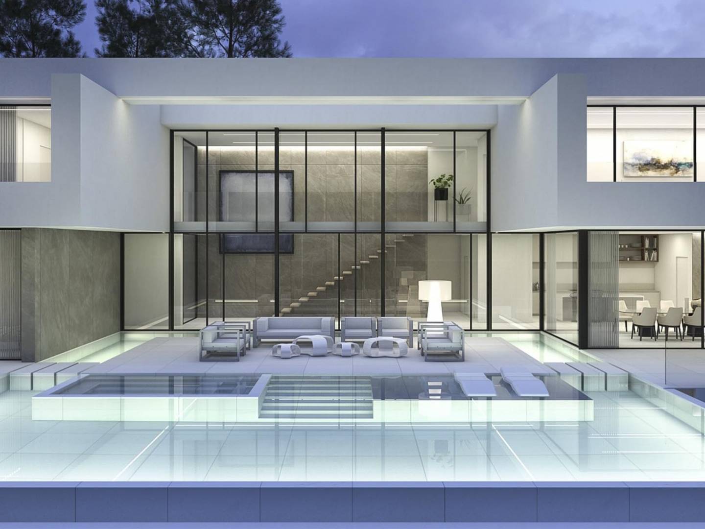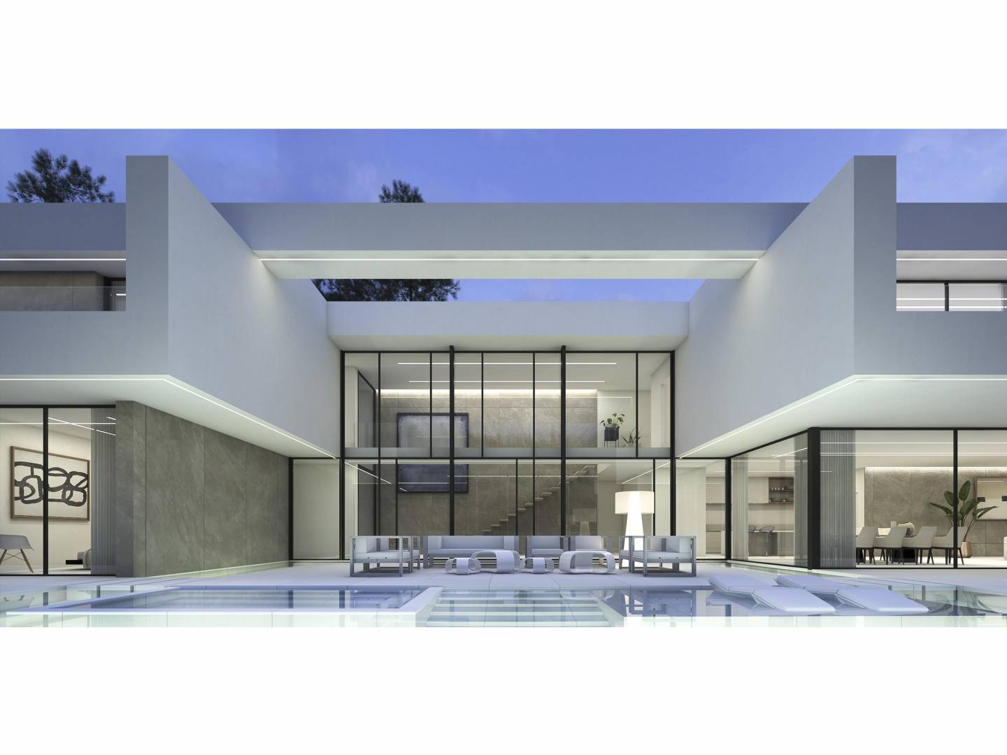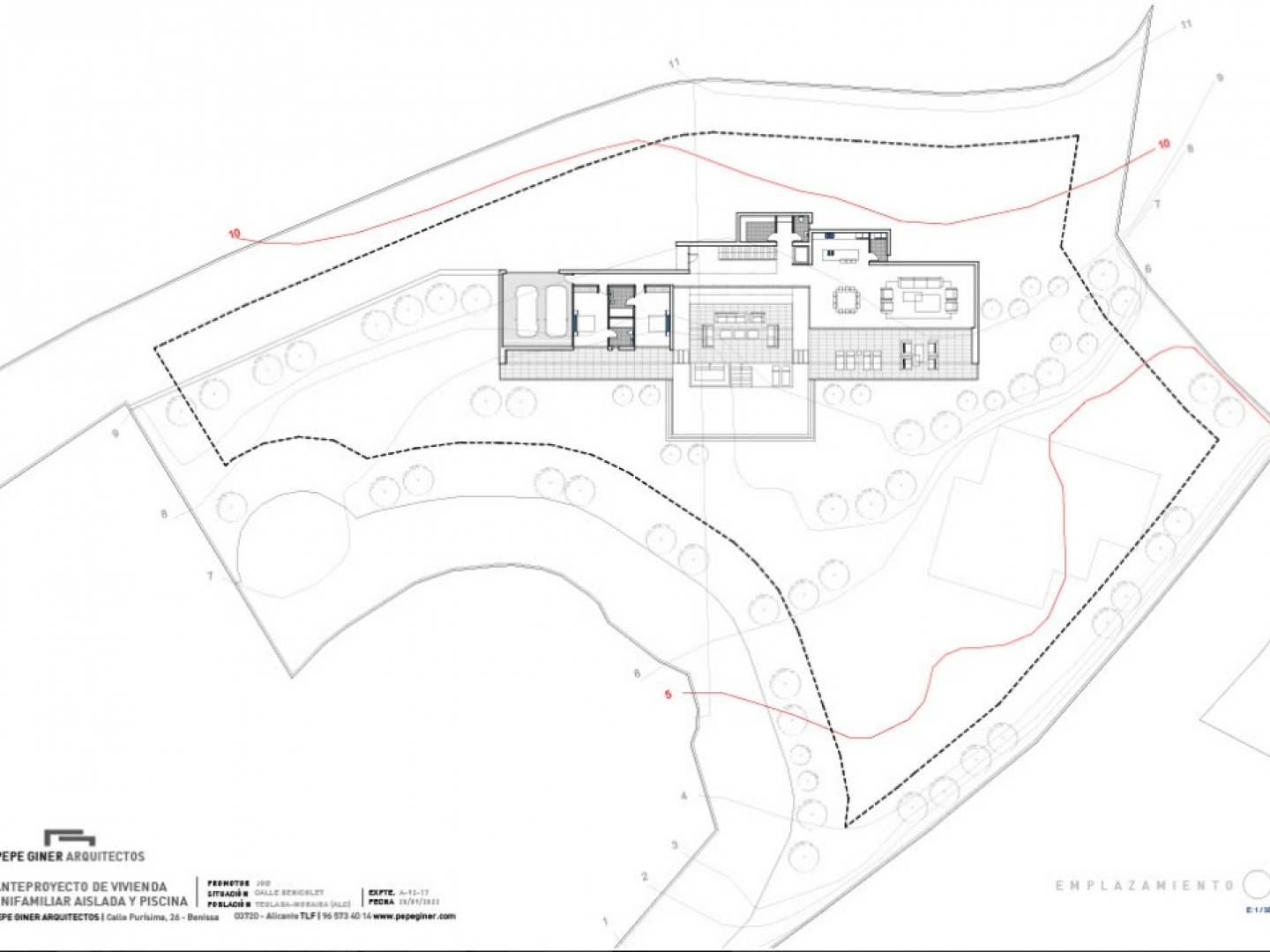 Proyecto para una villa de diseño moderno situado a poca distancia de Moraira. La vivienda se divide en dos plantas y cuenta con cinco dormitorios, un amplio salón-comedor, una cocina abierta, cinco baños y un aseo. También dispone de lavadero, garaje y varias terrazas. Aire acondicionado en toda la casa (conducta), calefacción central y ascensor. Puerta de entrada automática con entrada peatonal independiente e interfono. En el mismo nivel que la vivienda principal se encuentra la piscina. Pared y escalera de piedra en el jardín.