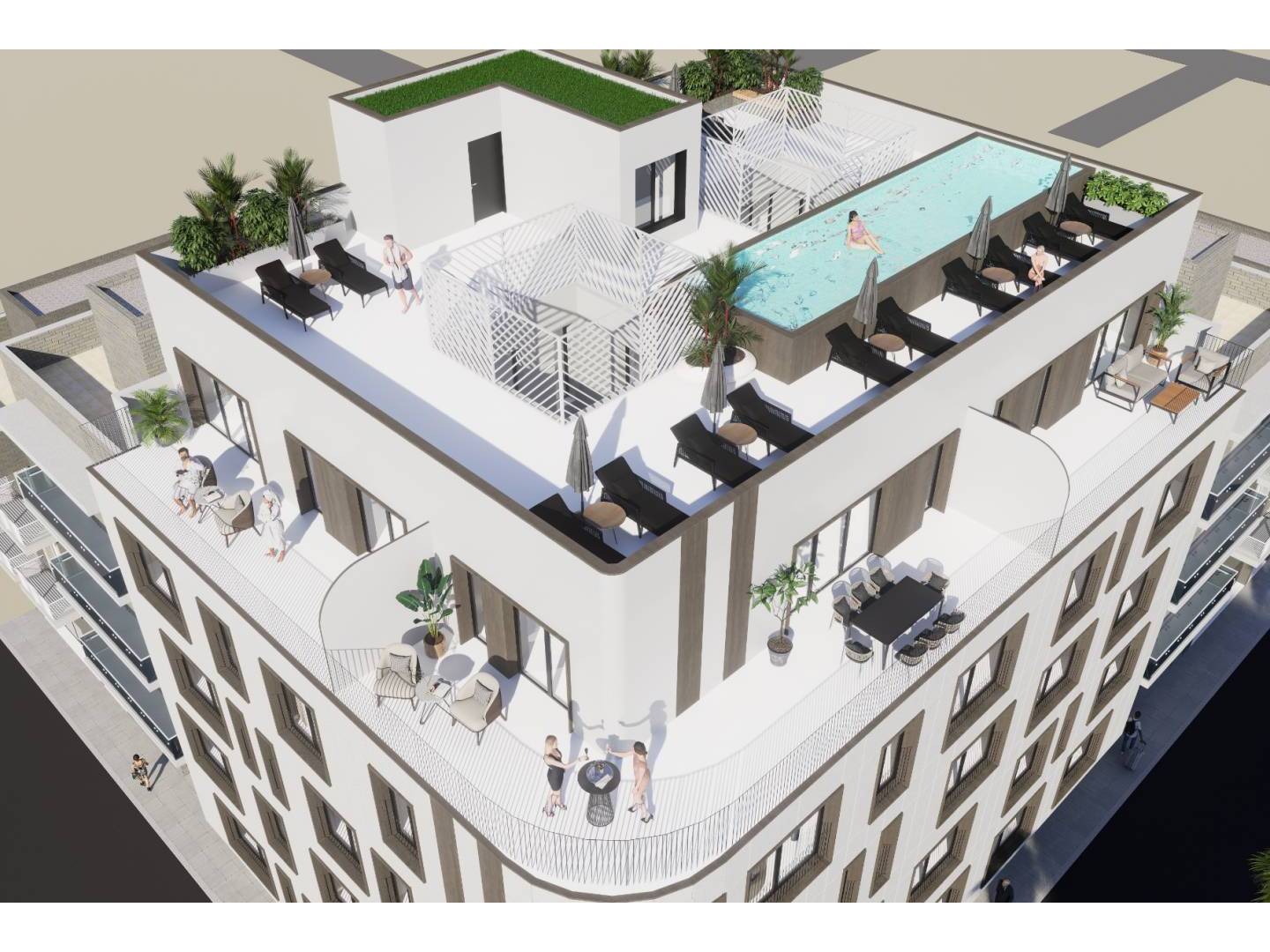 Descubre este moderno bloque residencial de 23 apartamentos situado a tan solo 60 metros de la Playa del Acequión, una de las más tranquilas y familiares de Torrevieja (Alicante). Con un diseño moderno y funcional, ofrece viviendas de 1, 2 y 3 dormitorios, incluyendo áticos con amplias terrazas privadas para disfrutar de la brisa mediterránea. El edificio cuenta con un solárium en la azotea con una fantástica piscina comunitaria, perfecto para relajarse bajo el sol. Además, dispone de plaza de garaje opcional. Este edificio es la combinación ideal de confort, estilo y ubicación privilegiada, ya sea para disfrutar de tus vacaciones o como inversión segura en la Costa Blanca.