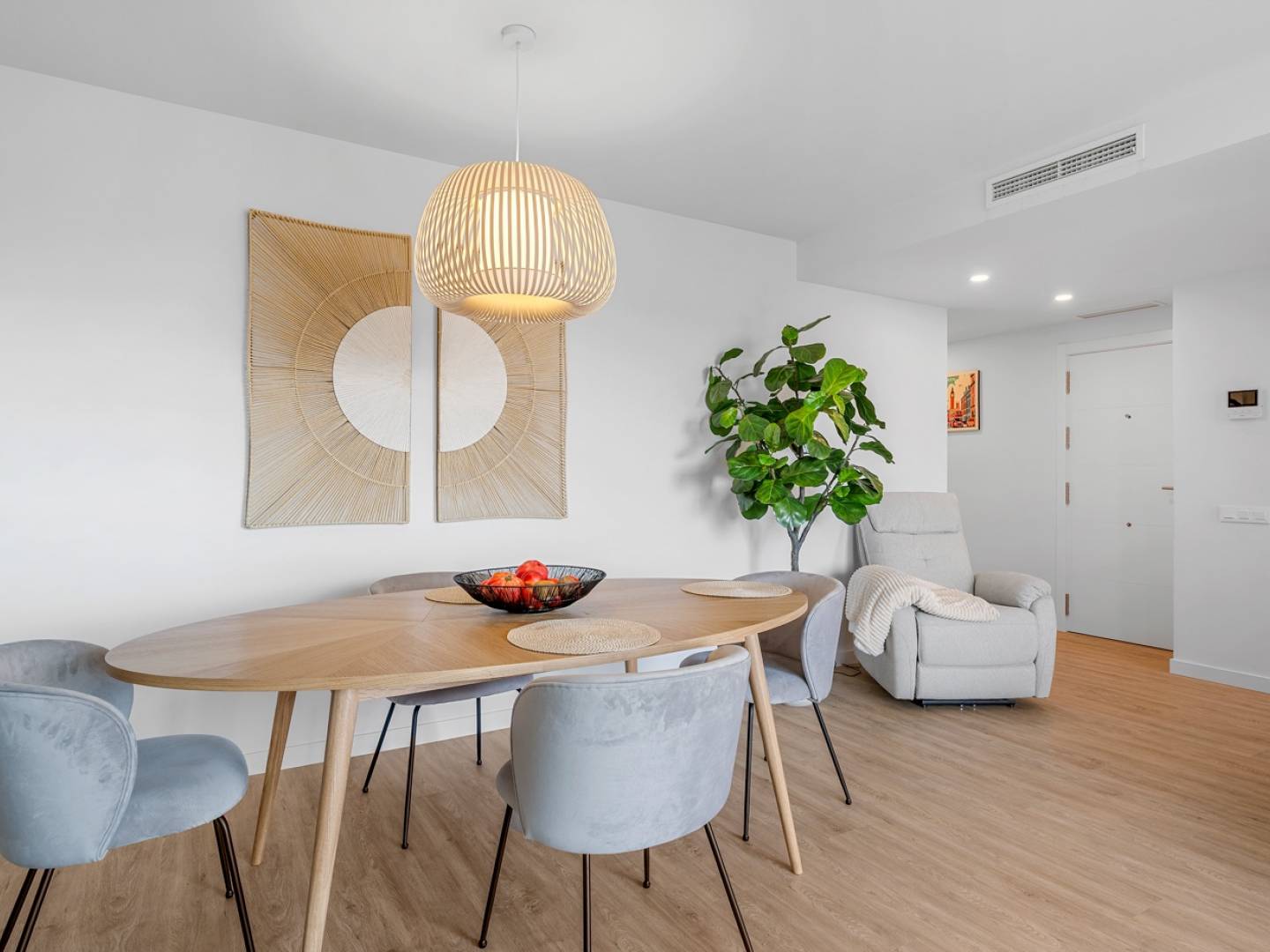 La vivienda dispone de 3 dormitorios luminosos con armarios empotrados, 2 baños completos (uno de ellos en suite), y una cocina abierta al salón-comedor, totalmente equipada con electrodomésticos de alta gama. El espacioso salón se abre a una gran terraza privada con vistas despejadas, el lugar perfecto para relajarse bajo el sol mediterráneo durante todo el año.