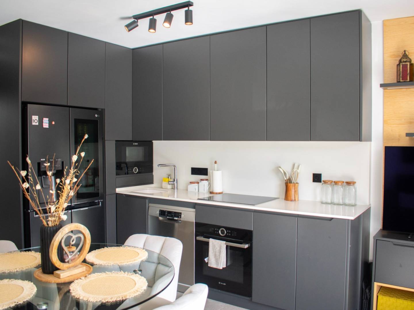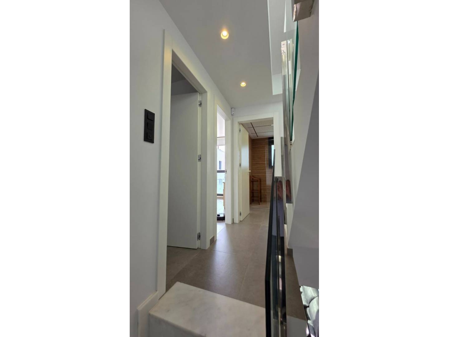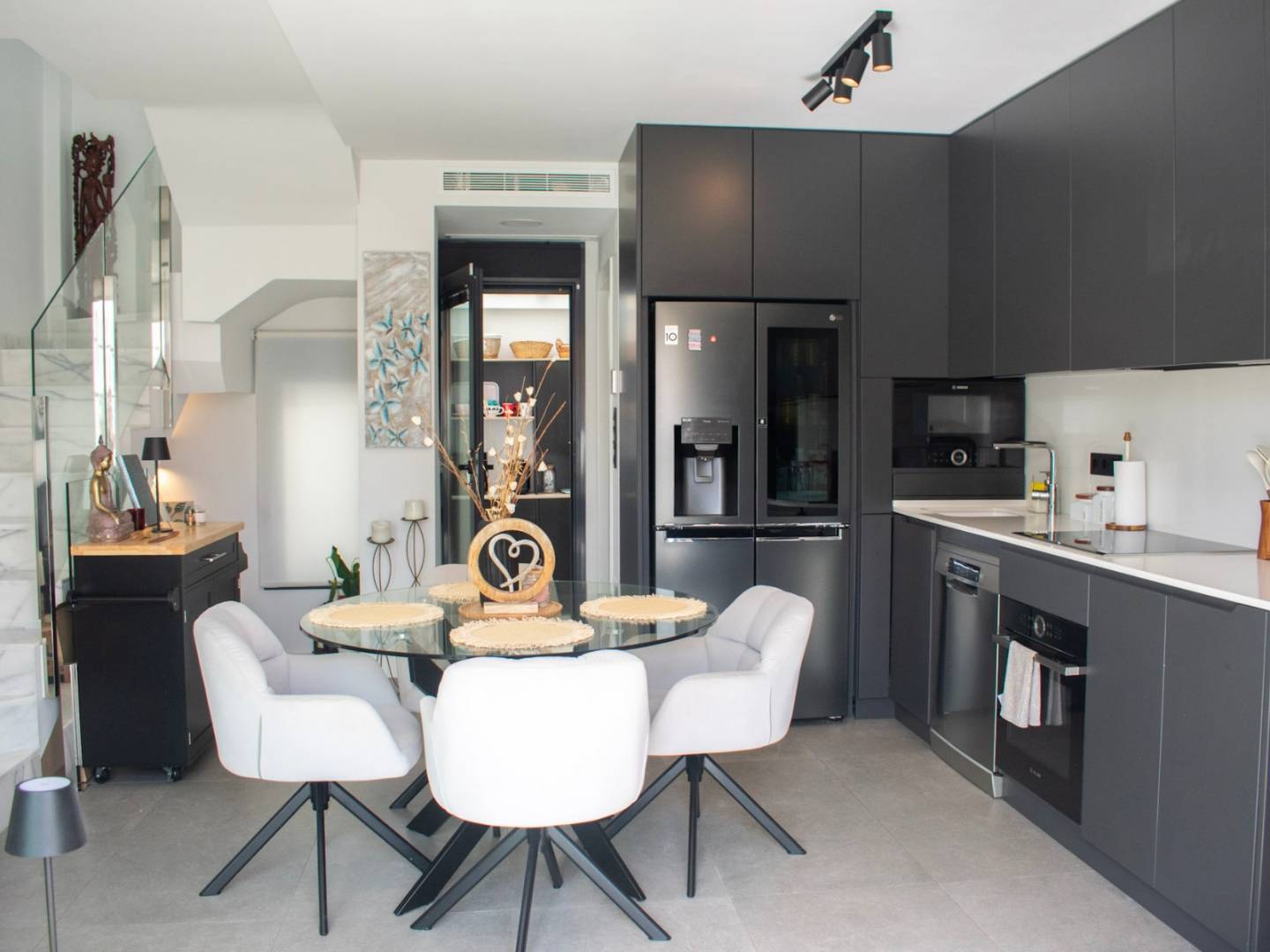 El amplio salón-comedor ofrece un ambiente cálido y luminoso, con acceso directo a una terraza privada desde la que se disfrutan impresionantes vistas al mar y la montaña, que también pueden apreciarse desde dos de los dormitorios. La cocina abierta, completamente equipada, está diseñada para quienes valoran el estilo y la practicidad. En el nivel inferior, un espacio polivalente con luz natural desde el techo ofrece múltiples posibilidades — puede utilizarse como dormitorio adicional, sala de cine en casa, sala de juegos, vestidor o zona de almacenamiento.