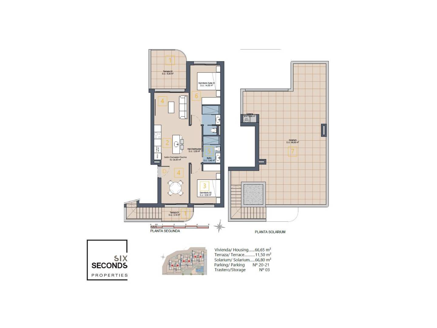 Cada vivienda dispone de 2 o 3 dormitorios y 2 baños, con una cocina abierta amueblada que se integra con el salón-comedor para aprovechar al máximo la luz natural y las vistas panorámicas al campo de golf y al mar. Los amplios solariums y terrazas privadas son el escenario ideal para disfrutar de los amaneceres mediterráneos o de una cena al aire libre con vistas inigualables.