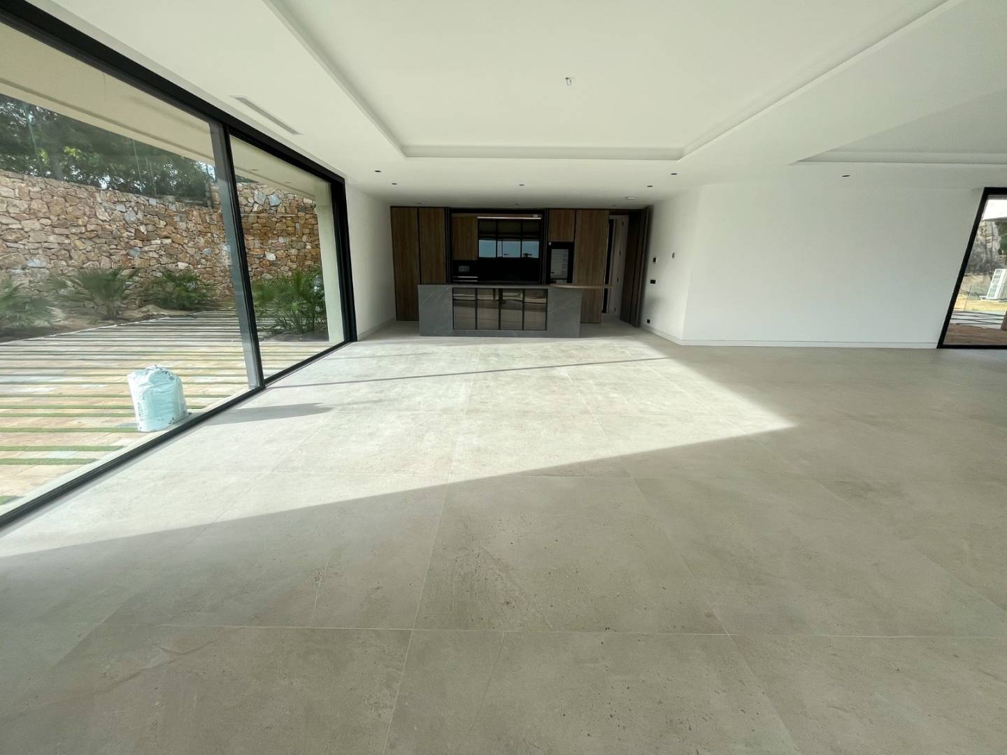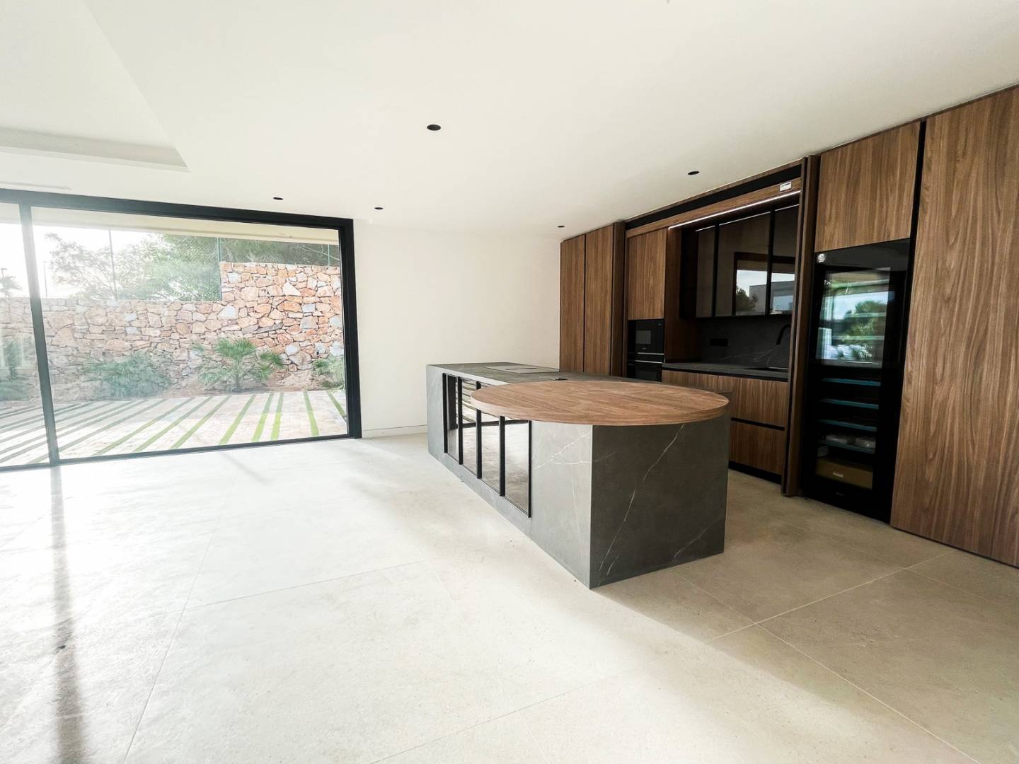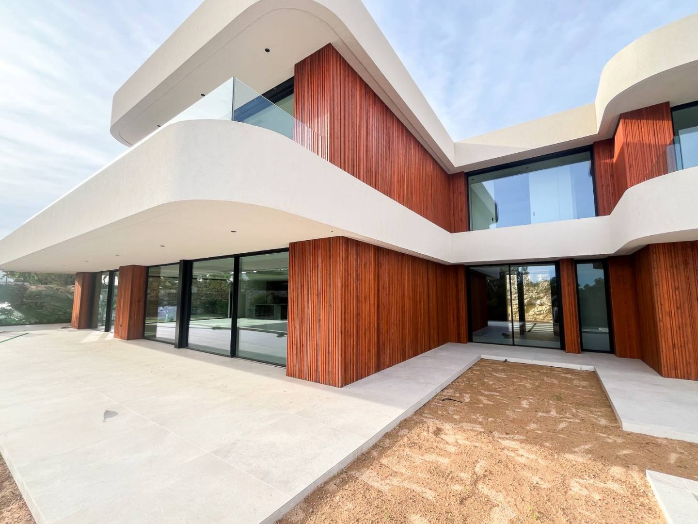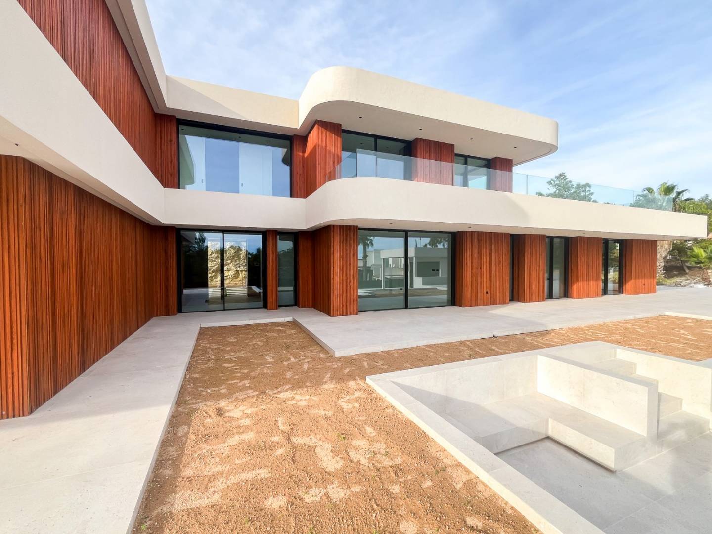 Con aproximadamente 876 m² y una parcela de 3.600 m², la villa destaca por sus líneas orgánicas y una materialidad noble que combina madera natural tratada, piedra y blanco mediterráneo. La arquitectura se abre al paisaje mediante grandes superficies acristaladas y una cuidadosa continuidad interior-exterior que permite que la luz, el jardín y el campo de golf formen parte de la vida diaria. La sensación es de calma, amplitud y privacidad auténtica.