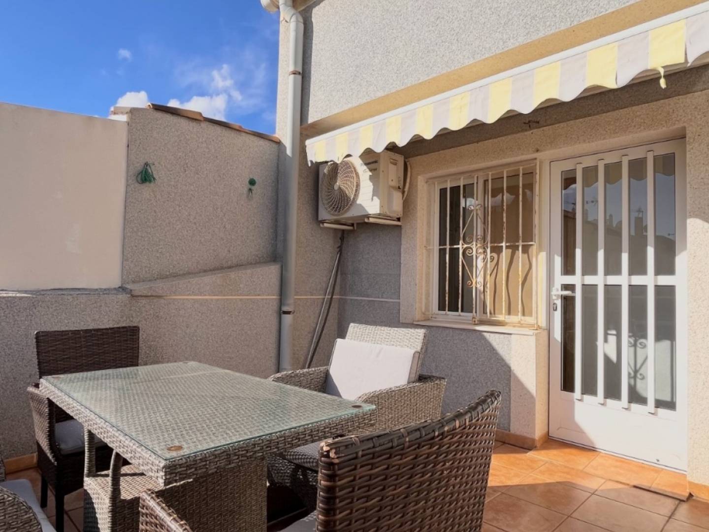 Bienvenido a esta acogedora y lista para entrar a vivir vivienda semiadosada situada en la tranquila zona de La Siesta El Salado Torreta en Torrevieja. Una propiedad renovada con buen gusto que ofrece comodidad, amplios espacios exteriores y una distribución funcional, ideal como residencia habitual, casa de vacaciones o inversión para alquiler. La vivienda se distribuye en dos plantas y cuenta con tres dormitorios con armarios empotrados y dos baños, uno de ellos en la planta baja junto a la zona de lavandería. El luminoso salón de concepto abierto ofrece un espacio cómodo tanto para el descanso como para reuniones familiares. La cocina está totalmente equipada, con placa eléctrica y de gas, además de preinstalación para lavavajillas. La vivienda dispone de aire acondicionado para mayor confort durante todo el año. En el exterior, encontrará una agradable terraza privada en la entrada con mobiliario, trastero y ducha exterior, perfecta para disfrutar del clima mediterráneo. En la planta superior se sitúa un amplio balcón con zona de barbacoa, comedor cubierto, vistas al parque y toldo retráctil. Ubicada a solo un minuto a pie del Parque Natural de La Mata, ideal para paseos y actividades al aire libre, y a unos diez minutos andando de instalaciones deportivas, restaurantes, farmacia y otros servicios. Las playas y centros comerciales se encuentran a pocos minutos en coche. Una excelente oportunidad para disfrutar de una vivienda cómoda en un entorno tranquilo y bien comunicado.