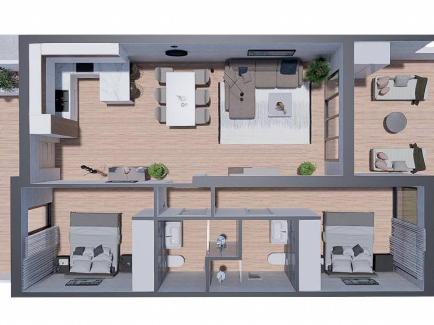 Precioso bungalow en venta en Torrevieja en un residencial privado con tres piscinas comunitarias, con vistas a la Laguna Salada de Torrevieja y al mar. A 1.5km de La Laguna y a 3.5km de las mejores playas de Torrevieja y Punta Prima. Con todos los servicios básicos disponibles a menos de 200m, como supermercados, tiendas, farmacias, bares, restaurantes, etc. Ubicación ideal para disfrutar de la tranquilidad en casa sin prescindir de las comodidades que una ciudad puede ofrecer: centros comerciales, ocio nocturno, ferias para visitar con los niños, parques de atracciones, paseos marítimos, Clubs de Golf, todos los deportes acuáticos que puedas imaginar, disfrutar de la naturaleza, y mucho más. Bungalow en planta baja de 131.07m² , con dos terrazas de un total de 57.00m² de donde podrás disfrutar de los días soleados del mediterráneo. Interior con un amplio salón comedor unido a una cocina americana con barra desayunadora en península, dos dormitorios dobles, uno de ellos en suite con baño, incorporado, un baño independiente y zona de lavandería con acceso desde el exterior. PLAZA DE APARCAMIENTO : 10.000€ INCLUIDO PRECIO