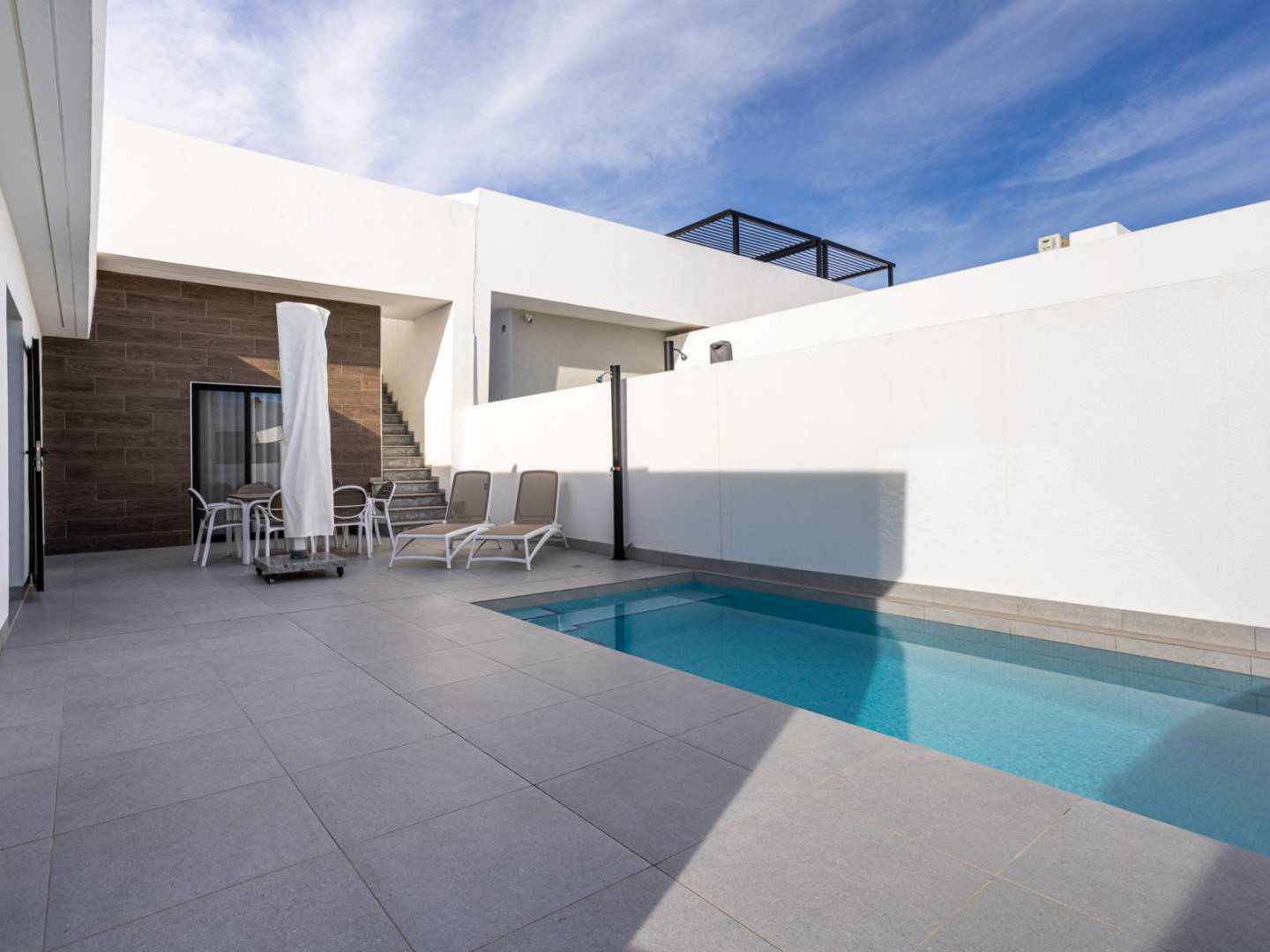 Descubra esta elegante villa independiente en Torre-Pacheco, una propiedad que combina a la perfección estilo de vida mediterráneo, privacidad y confort moderno en una tranquila zona residencial, a pocos minutos de todos los servicios. Construida sobre una parcela privada de 151,71 m² y con 85 m² construidos en una sola planta, esta vivienda ofrece una distribución práctica y funcional, ideal tanto como residencia habitual, segunda vivienda o inversión inmobiliaria. Gracias a su orientación este, la vivienda disfruta de abundante luz natural durante todo el día. El interior dispone de 3 dormitorios con armarios empotrados, 2 baños modernos , cocina americana equipada, salón-comedor luminoso y un práctico lavadero independiente. La propiedad se vende completamente amueblada, con electrodomésticos incluidos y aire acondicionado, lista para entrar a vivir. En el exterior destaca su espectacular piscina privada, rodeada de jardín privado, porche cubierto, terraza exterior y un exclusivo solárium con zona de sombra y cocina exterior, perfecto para disfrutar del clima de la Costa Cálida durante todo el año. Además, cuenta con aparcamiento privado en parcela y sistema de intercomunicación. Ubicación estratégica: playas a 20 minutos, Aeropuerto Internacional de Murcia a 15 minutos, campos de golf a 5 minutos y zonas comerciales y restauración a 5 minutos. Una oportunidad única para quienes buscan villa con piscina privada en Murcia con excelente ubicación y lista para entrar a vivir.