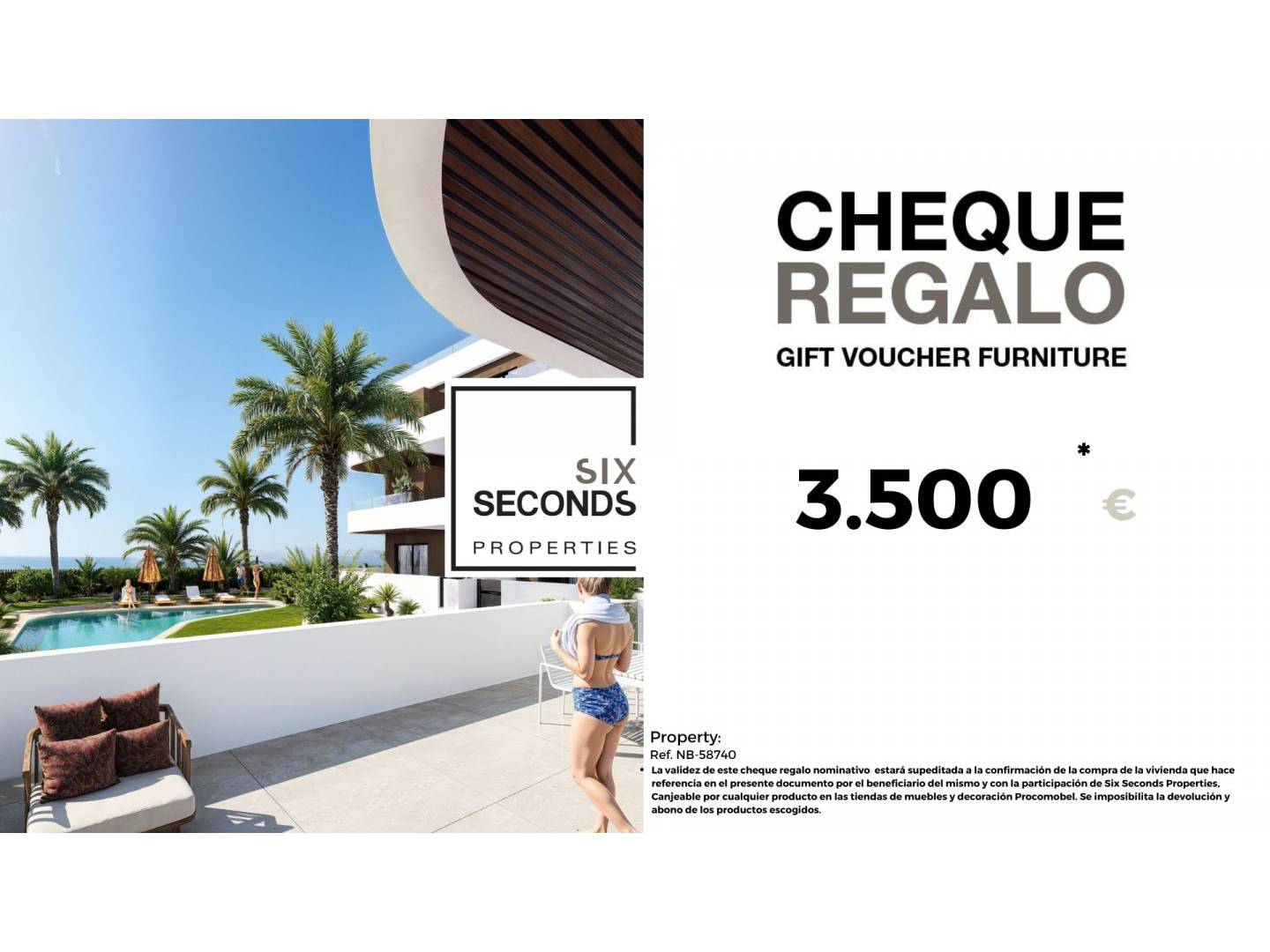 En Six Seconds Properties te ayudamos a convertir tu nueva propiedad en la casa de tus sueños, regalándote un cheque regalo en mobiliario por una cantidad de 3.500€ y una visita técnica de la vivienda, donde nuestro equipo técnico te aconsejará sobre las posibilidades de mejora de la vivienda. Totalmente gratis !!