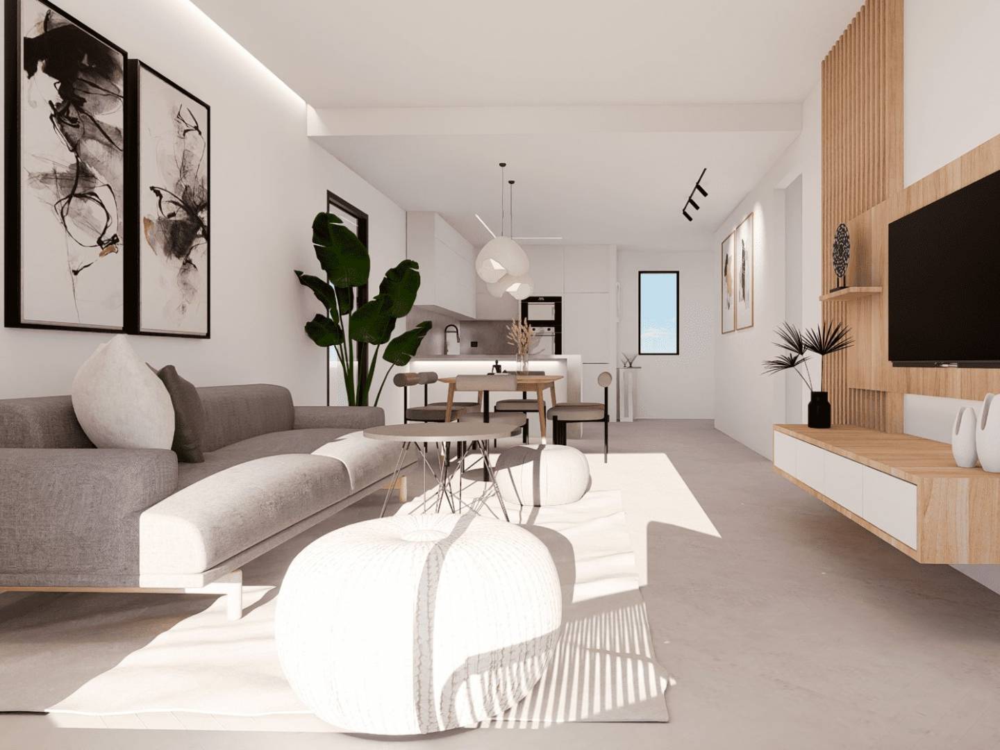 El interior de las viviendas está cuidadosamente diseñado para ofrecer confort y modernidad. Los apartamentos, bajos y áticos cuentan con suelos de gres porcelánico, que aportan un toque elegante y son fáciles de mantener. Todas las propiedades están equipadas con aire acondicionado, garantizando un ambiente agradable durante todo el año. Los armarios empotrados proporcionan un amplio espacio de almacenamiento, mientras que el videoportero añade un nivel adicional de seguridad y comodidad. La distribución incluye dos dormitorios y dos baños, adaptándose a las necesidades de diferentes tipos de familias.