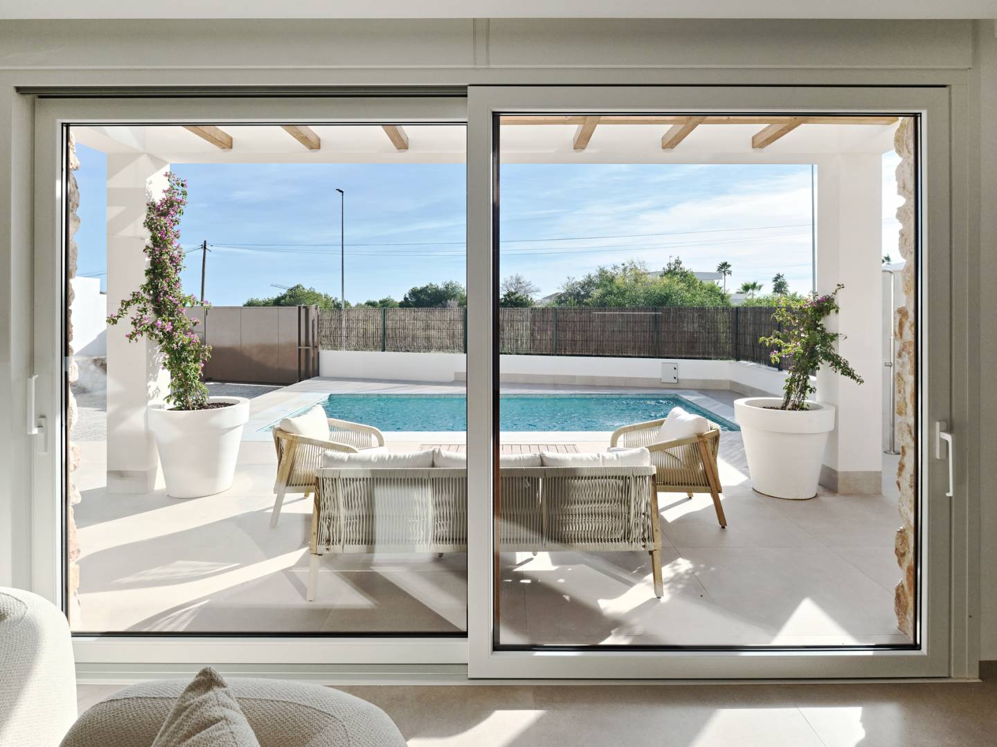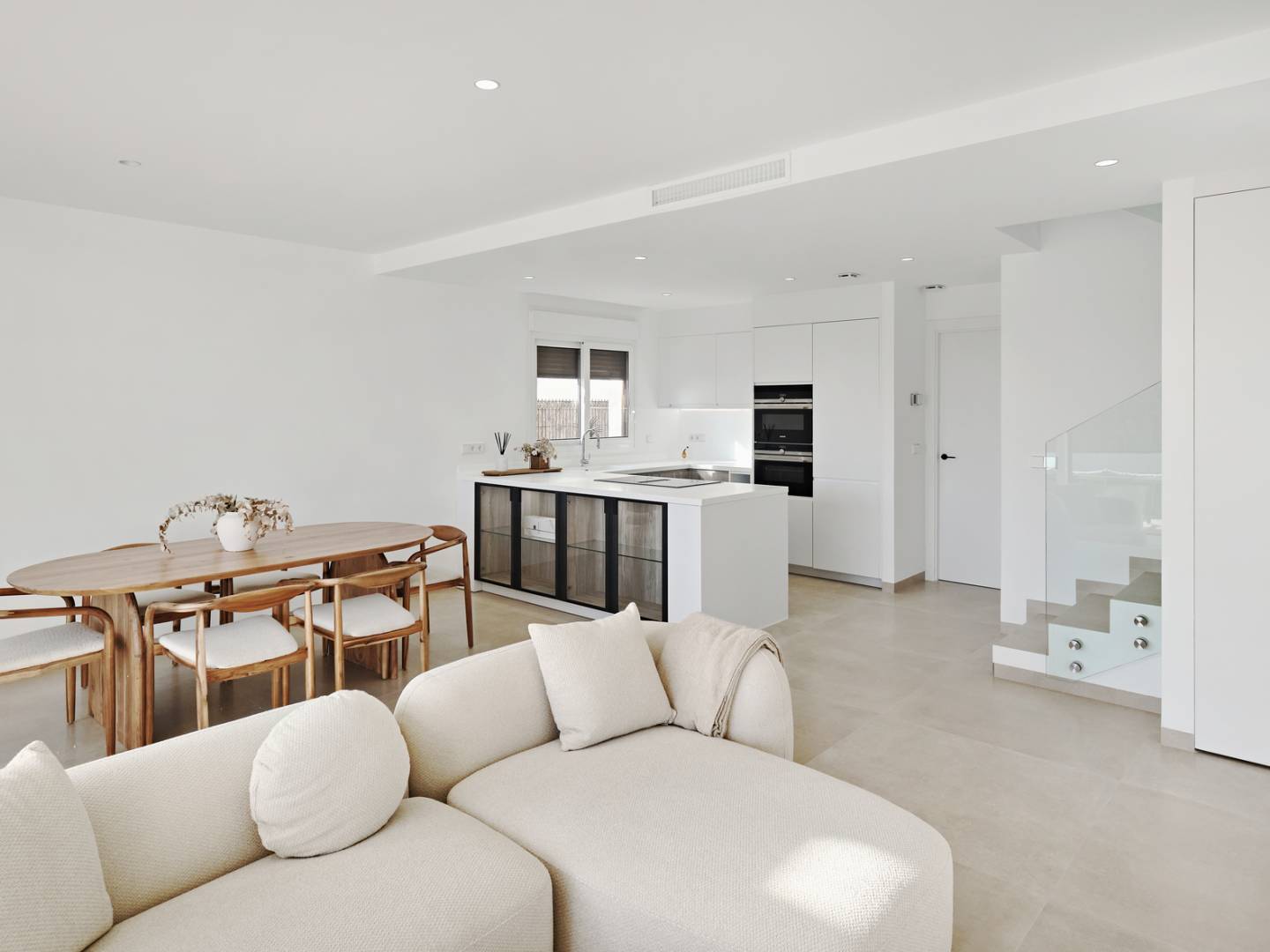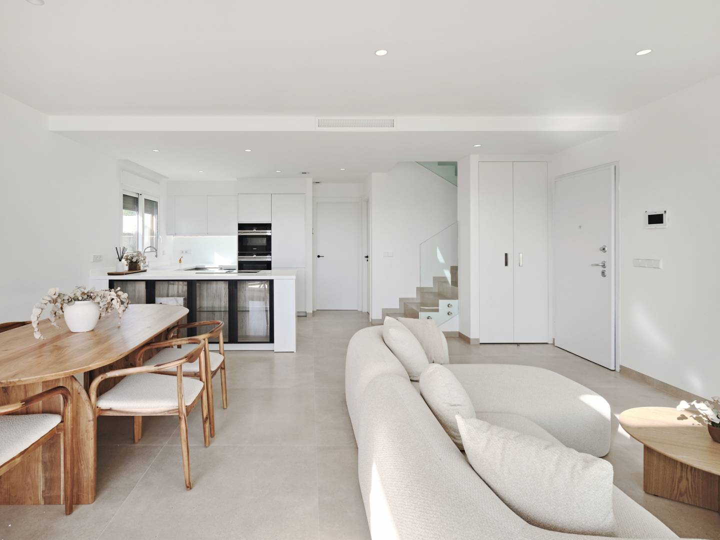 El interior del chalet está diseñado para ofrecer el máximo confort. Dispone de tres dormitorios, lo que lo hace perfecto para familias o para recibir invitados. Los dos baños están equipados con acabados modernos. La cocina está equipada con electrodomésticos de alta calidad, facilitando las tareas diarias. El sistema de aire acondicionado garantiza una temperatura agradable durante todo el año. Los suelos de gres porcelánico aportan un toque elegante y son fáciles de mantener. Además, cuenta con armarios empotrados que optimizan el espacio de almacenamiento. La seguridad está reforzada con un videoportero, proporcionando tranquilidad a sus residentes.