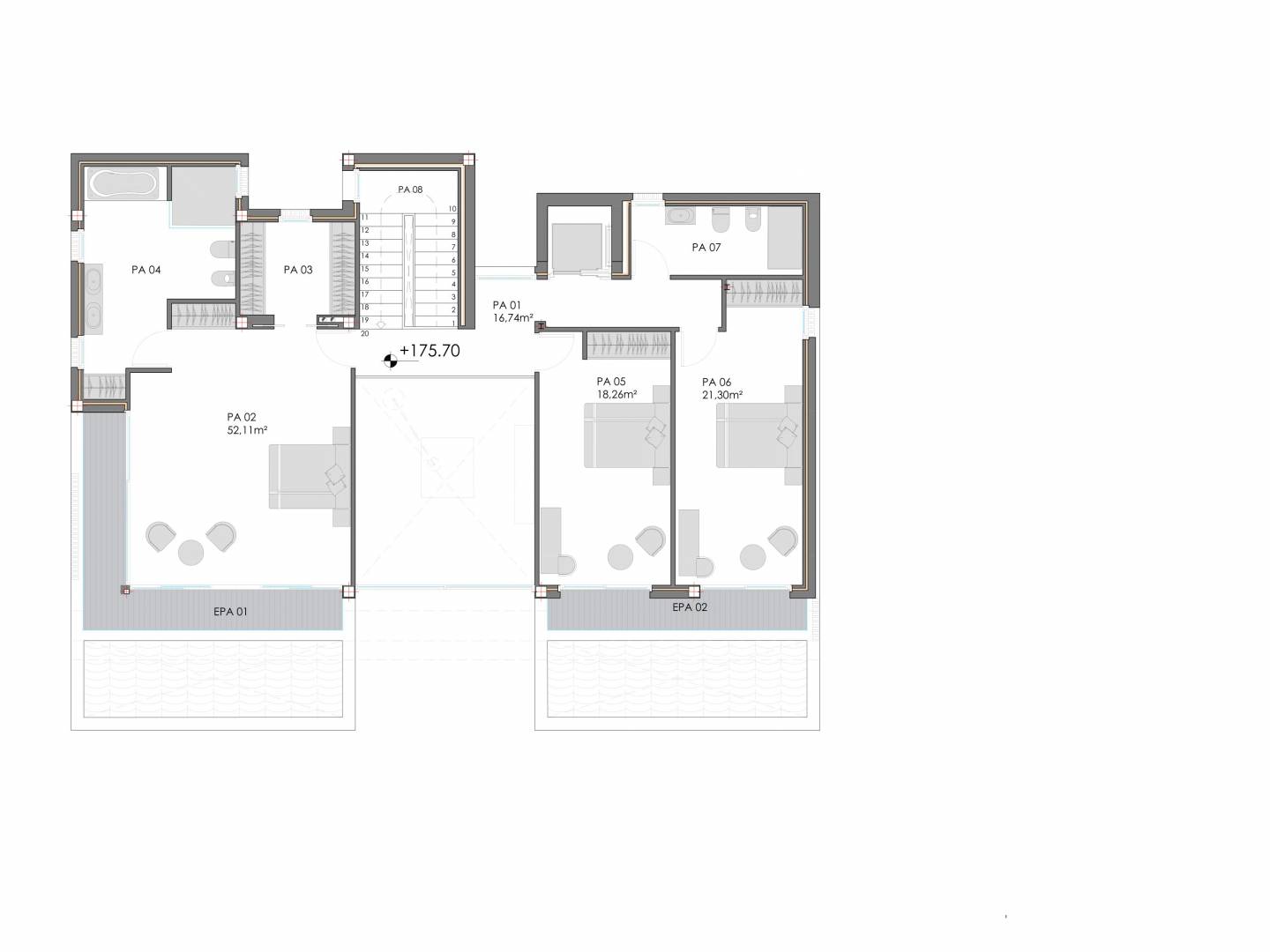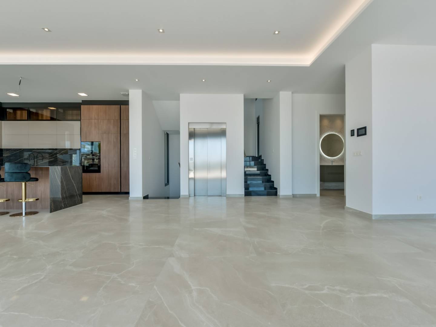 El interior de las villas en Golf Bahía está diseñado para ofrecer el máximo confort y funcionalidad. Los suelos de cerámica aportan un toque moderno y elegante a cada estancia. Las villas están equipadas con electrodomésticos de alta calidad, asegurando que la cocina y otras áreas del hogar sean prácticas y eficientes. La domótica integrada permite un control total de las funciones del hogar, desde la iluminación hasta la climatización, mejorando la comodidad diaria. Las persianas eléctricas ofrecen un control sencillo de la luz natural y la privacidad. Los armarios empotrados en los dormitorios proporcionan un amplio espacio de almacenamiento, manteniendo el orden y la organización en el hogar.